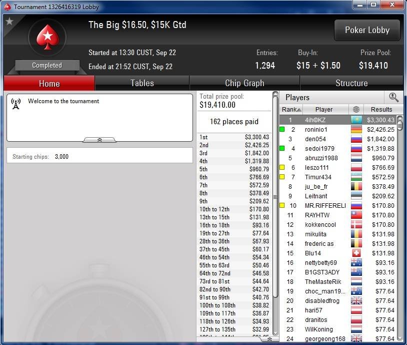 Без дележки за финальным столом в Big $16,50 на PokerStars Илья «Apple.4iH» выиграл более $3К.