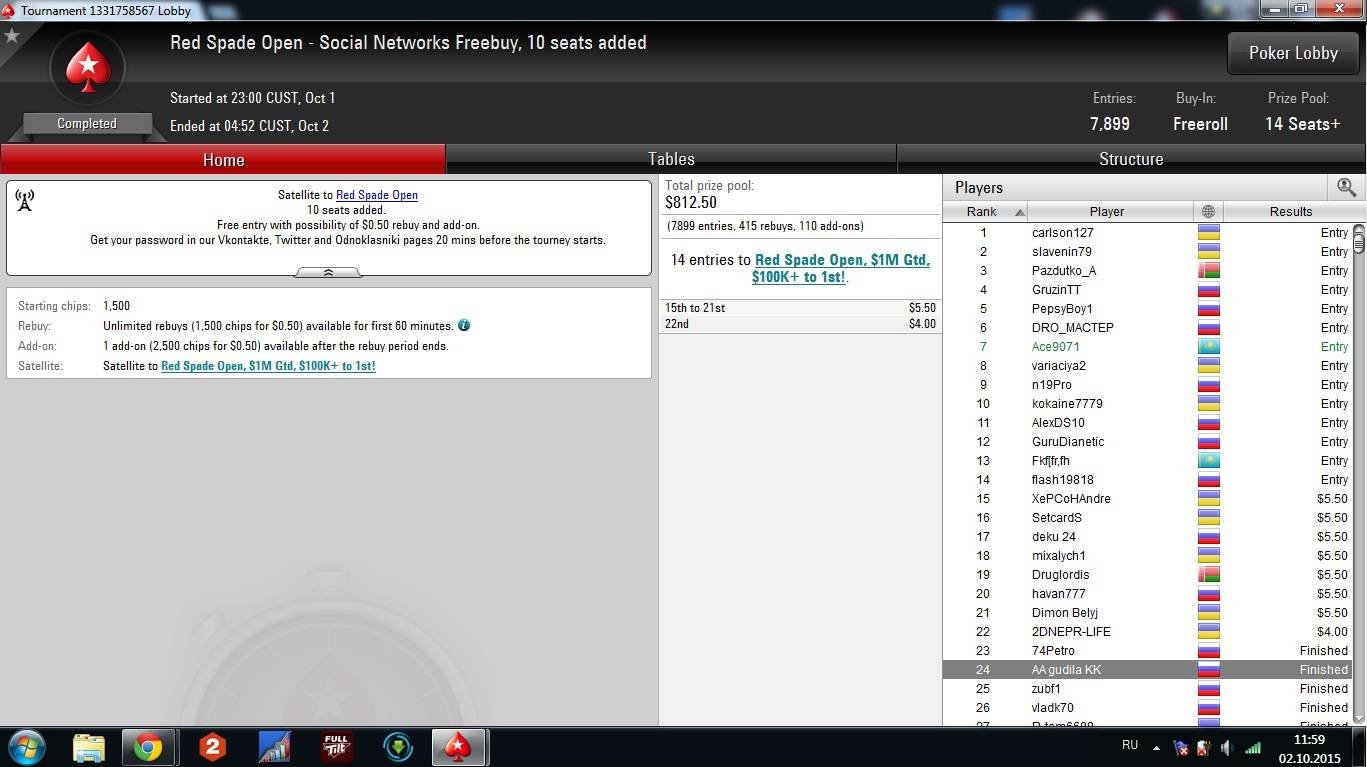 Уже в 1 октября отписался Иван “Lucker”, приложив скрины выигранных им фрироллов, где в первом он просто занял 1 место, а во втором получил билет на Red Spade Open за $55, который состоится уже в воскресенье, 4 октября:
