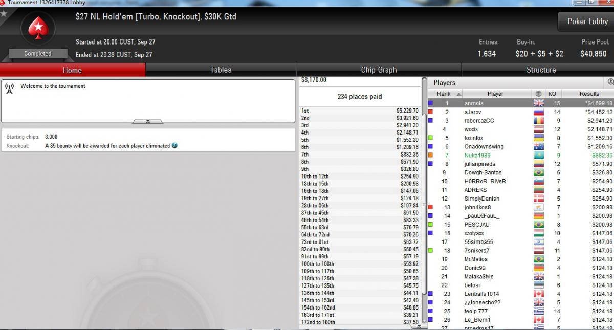 Всем здравствуйте и доброго времени суток! Решил сделать запись, дабы не хоронить свой дневник в пучину этого раздела. Двадцать девятого августа, через недельку после файнал тэйбл в биге за 3.3$, сделал полный кэшаут, ни цента не оставил. Поступил так по двум причинам; во-первых, в общем за всё время игры на ПС, исчисление которой началось аж в две тысячи одиннадцатом году, я игрок минусовой. Понятно, скиллом я не блещу, но это не единственная моя покерная беда. К хилому скиллу можно смело прибавить и не серьёзное отношение к покеру. За четыре года наконец-то дошло, что к покеру не серьёзно относится нельзя. Ты либо окунаешься в покер с головой и стабильно плюсуешь, либо машешь рукой после каждого вылета перед ИТМ и успокаиваешь себя, — в следующий раз то, точно доедет топ один. Ну и вторая причина, естественно, деньги то не лишние, благо доллар сейчас нам машем с о-о-о-очень высокой колокольни. Так вот, вывел зарубежные зелёные бумажки, до девятнадцатого сентября почти не играл, разве что баловался на Лотосе во фрироллах. Девятнадцатого сентября в шутаутах-фрироллах на ПС доехало аж пять баксов и двадцать центов в двадцати четырёх турнирах. Решил играть дешёвые СнГ на 45 человек, не уходя с них пока не будет нормальное кол-во бай-инов на следующий лимит аналогичных СнГ. Дистанция пока очень маленькая, играю мало. Радует что есть плюс, хотя последние два дня до вчерашнего было нереально тяжело, На предфиналках не могут устоять мои префлоп топ-пары.Специально заглянул в ХМ и подсчитал, что из девяти последних карманных дам/королей/тузов я выиграл всего один префлоп оллын, тем паче, что в восьми из девяти случаев у соперника не было и тридцати процентов на префлопе. Вчера эта байда закончилась, надеюсь трудности позади. В общем, суть в том, что я решил в покеррумы больше депозитов не делать. Последний депозит был сделан аж вначале лета, и это действительно последний депозит, теперь будут только кэш-ауты. Ну и напоследок, поделюсь парочкой относительных успехов, которым я очень рад.