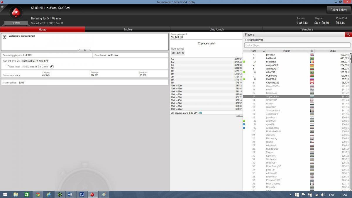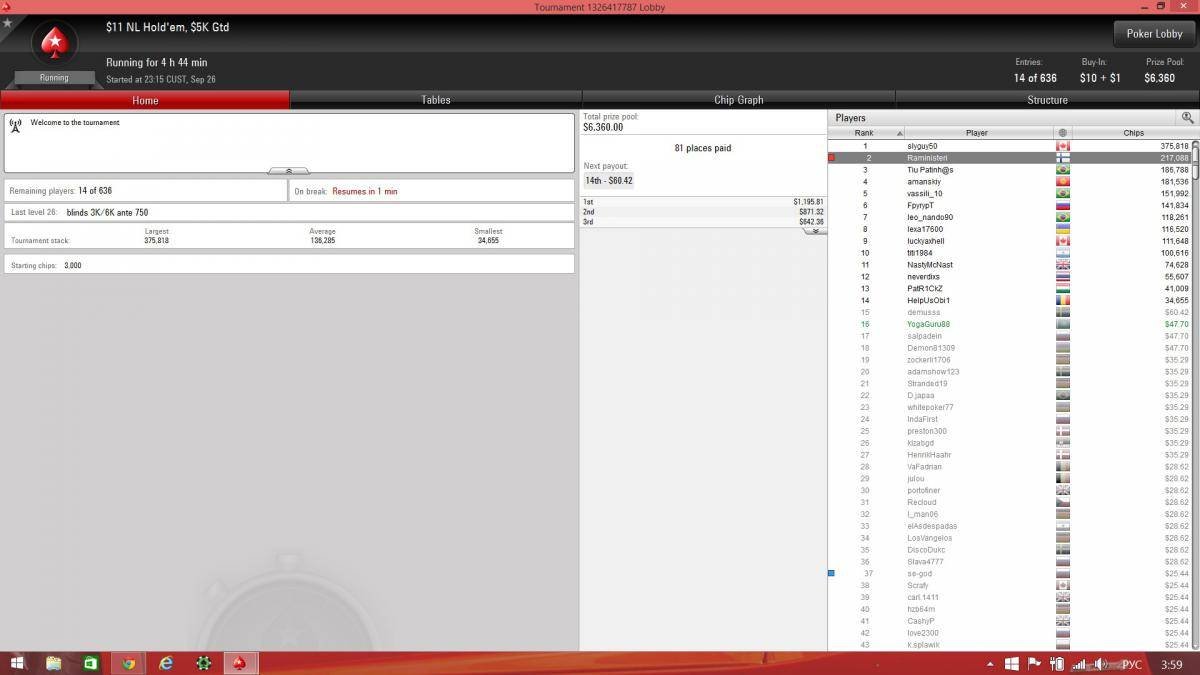 Немного о себе: Меня зовут Евгений, ник на PS: Eugeniy-KK. Живу в Астане. Возраст 28 лет. Работаю в охранной фирме — техником/слаботочником. Люблю играть на гитаре. Год назад бросил курить можно сказать ради покера — (Помог сюжет о покере — в частности о здоровом образе жизни, питании и о том как положительно это сказывается на игре в целом, а так же выносливости в течении долгого турнирного дня). Иногда посещают мысли перестать есть мясо и питаться овощами, но пока не готов Играю в покер около полутора лет. Весь прошлый год играл удовольствия ради и был огроменным фишом. Да таким про которых говорят: «Как таких земля носит?! Как можно колировать 6-бет ол*ин с ?!» Признаюсь, в то время я считал что в покере решает только удача и хорошо проводил время. С тех пор кое что изменилось. С марта 2015 года стараюсь играть по банкроллу, немного подкачался в скиле, фишом конечно быть не перестал. НО тем не менее, проделана огромная работа по контролю над эмоциями и борьбе с тилтом. На данный момент играю СНГ за 1,5 $ |