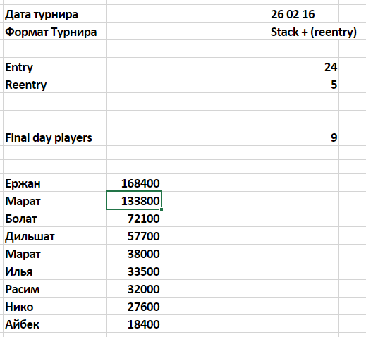 Стеки наших форумчан: Марат Марчелло 160к Илья Apple4ih более 400k Алмас почти 100к Саша Ламент 310к Чингиз 130к Женис 280к Мура около 100к 17 уровень, 2к/4к/500, средний стек 165к В игре 12 человек. |
