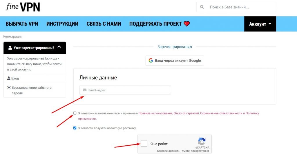 1. Перейдите на сайт fineVPN и зарегистрируйтесь (нужно ввести только почту) — https://finevpn.org/account/register.php