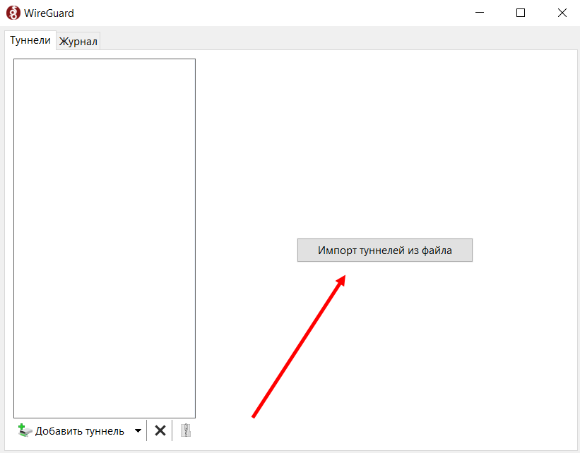7. Запустите скачанную программу WireGuard, нажмите «Импорт туннелей из файла» и выберете скачанный файл с настройками