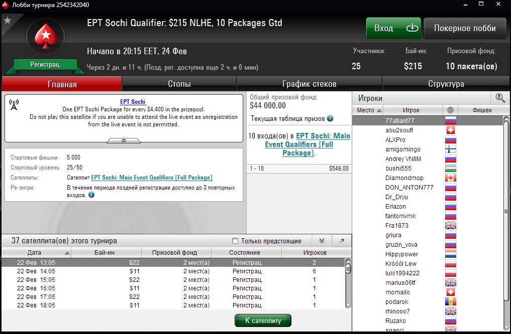 На все прямые сателлиты за $215 можно попасть через куда более дешевые отборочные турниры, начинаются они с бай-ина $2,20, или выиграть билеты во фрироллах.