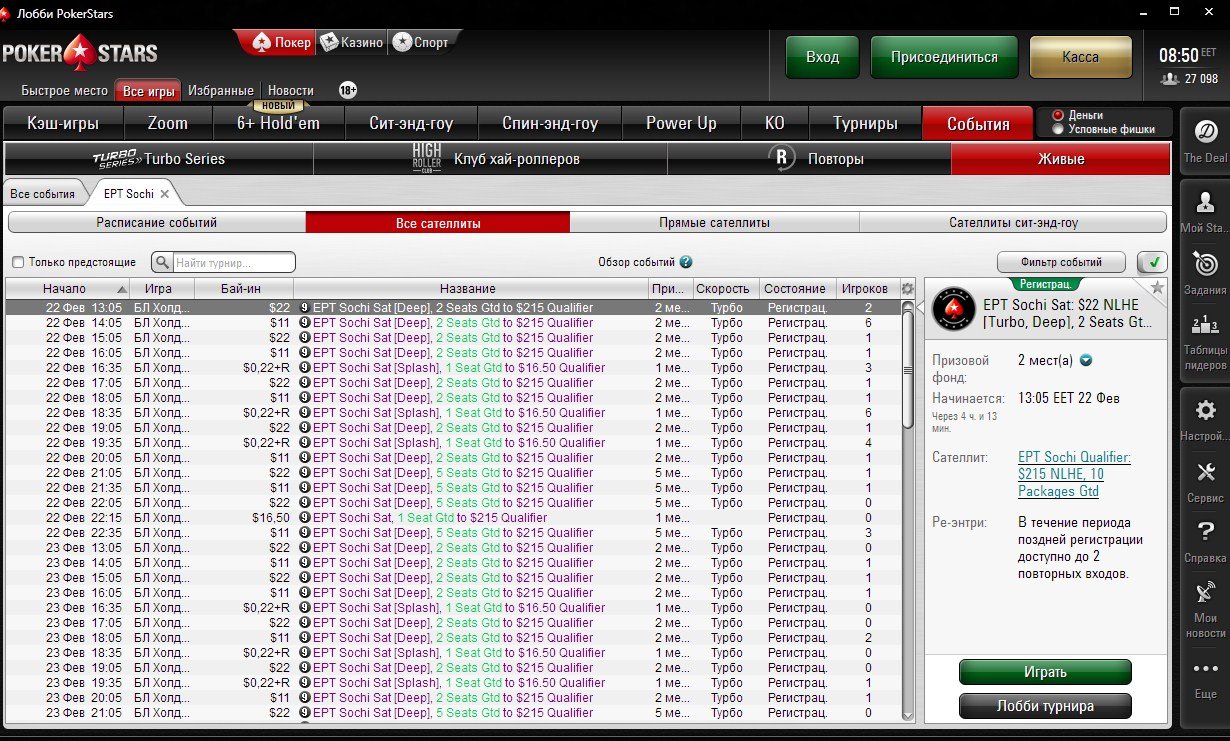 Все сателлиты можно найти в отдельной вкладке покерного клиента ПокерСтарс: