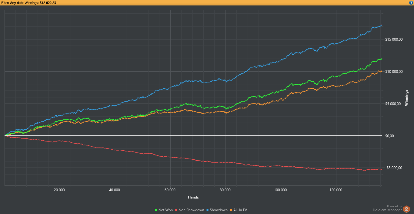Вот график, который был отправлен мне по электронной почте на днях. Игрок начал играть НЛ2 год назад, используя этот простой метод, подсказанный мною. Теперь он сокрушает НЛ50.