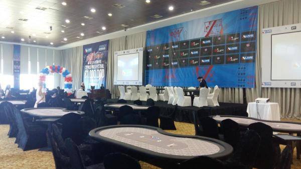 Что стоит отметить по организации серии. Игровой зал очень просторный, большой. А вот стулья не очень, они обычные банкетные, наряду с покерными столами смотрятся как-то нелепо. На вместительной подиумной сцене в центре зала также установлены два стола: на них проводят финальные столы турниров. Через окна открывается шикарная панорама на море и очень радует и успокаивает глаз, особенно после тильтовгоняющих раздач.