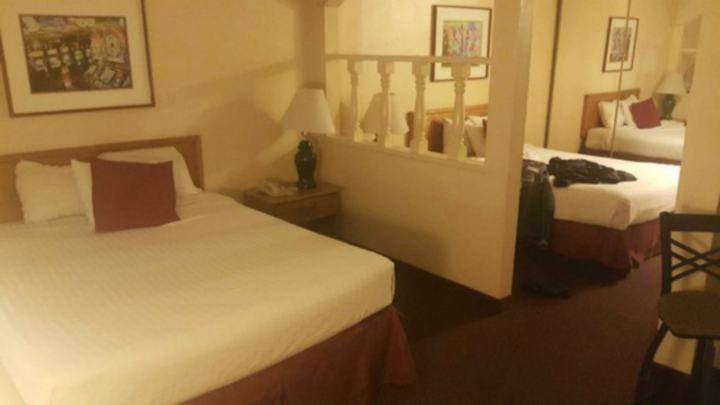 Прилетели в Вегас 25 мая. Мы здесь впервые. Остановились в Mardi Gras Hotel. Это 3-звездочный отель, находящийся в двух кварталах от Strip (Прим. Стрип — главная улица Лас-Вегаса, на которой расположено большинство казино и самые значимые достопримечательности). Сам отель обычный, ничего в нем такого нет. У нас две комнаты, две кровати. В номер приходим только поспать