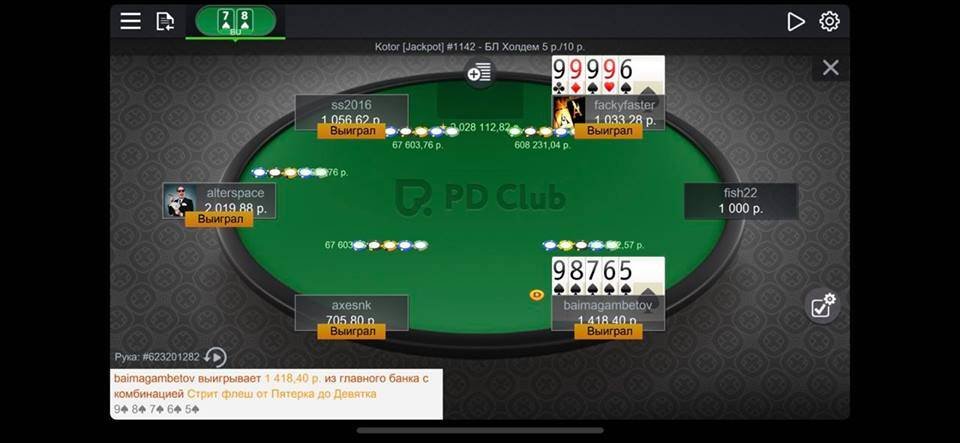 За столом безлимитного техасского холдема ‘Kotor [Jackpot] #1142’ на лимите 5 р./10 р. разыгрался 191-й Bad Beat Jackpot, где одним из победителей стал казахстанский игрок “baimagambetov”.