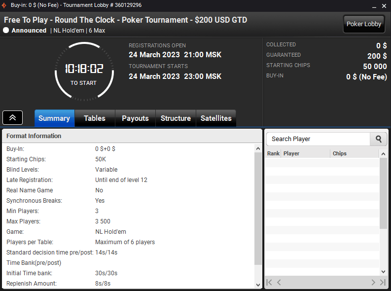Фрироллы Round the Clock не требуют паролей. Все, что вам нужно сделать, это найти эти бесплатные турниры, щелкнув фильтр «Фрироллы» на вкладке турниров, или отсортировать турнирное лобби по бай-ину. В каждом фриролле предусмотрена 60-минутная поздняя регистрация на случай, если вы опаздываете или не сможете стартовать в самом начале.