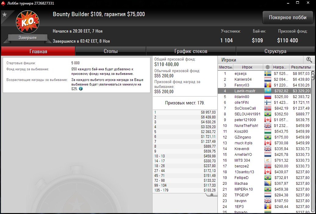 Лаврентий “Lavrik-mastr” вошел в топ-4 турнира с наградами за выбивание на PokerStars. Баунти Билдер за $109 собрал 1,104 участника, тем самым увеличив гаран…