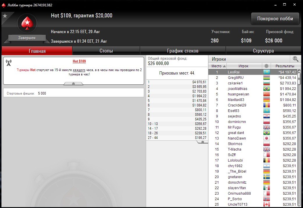 “LeoRai” из Казахстана занял первое место в турбо-турнире Хот с бай-ином $109 и гарантией $20,000. Ивент состоялся 20 августа и собрал 260 игроков. Выплаты с…