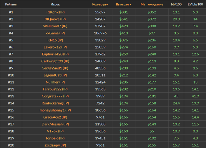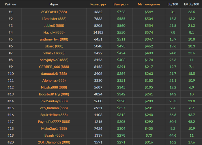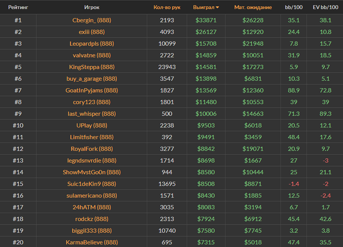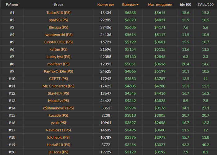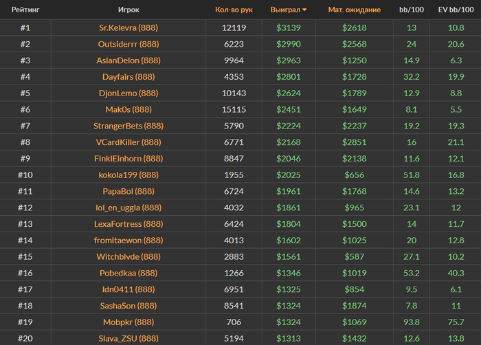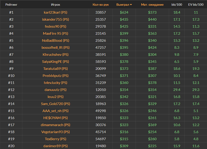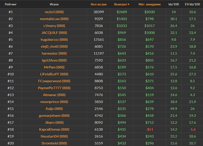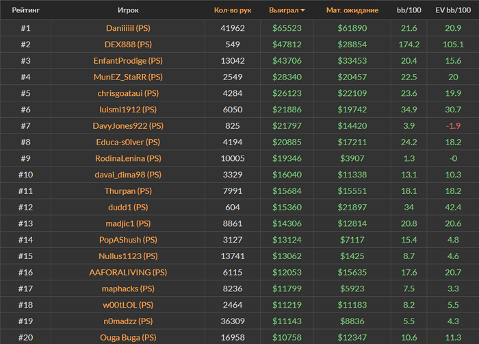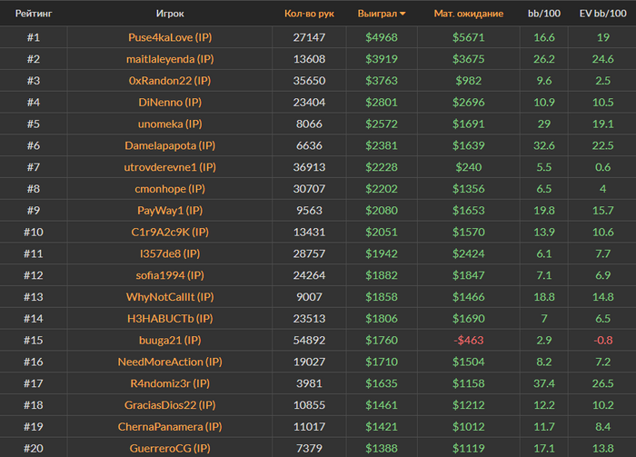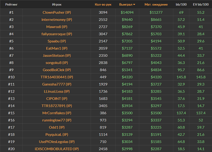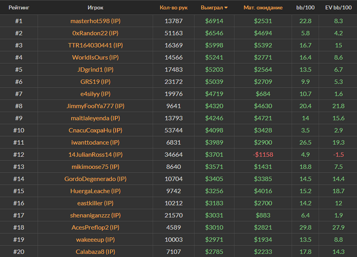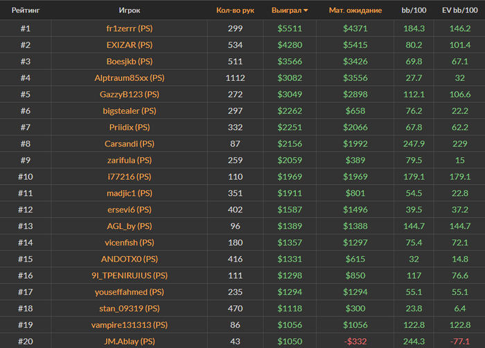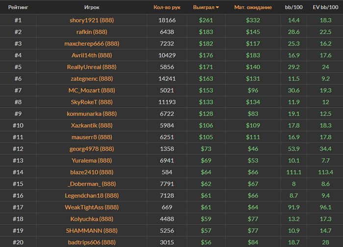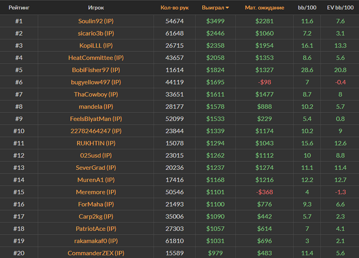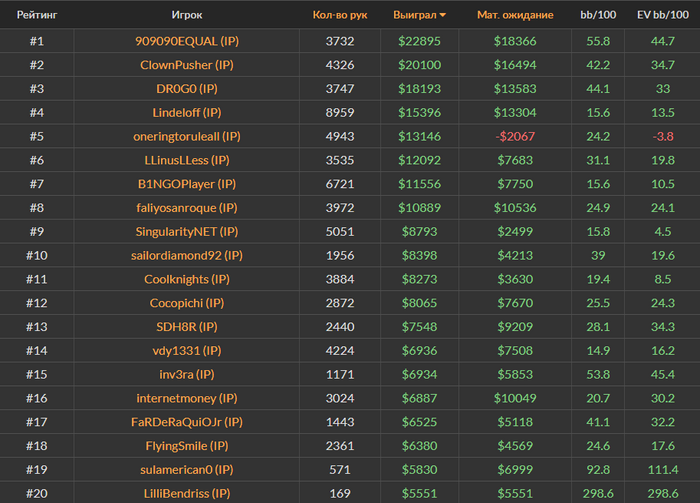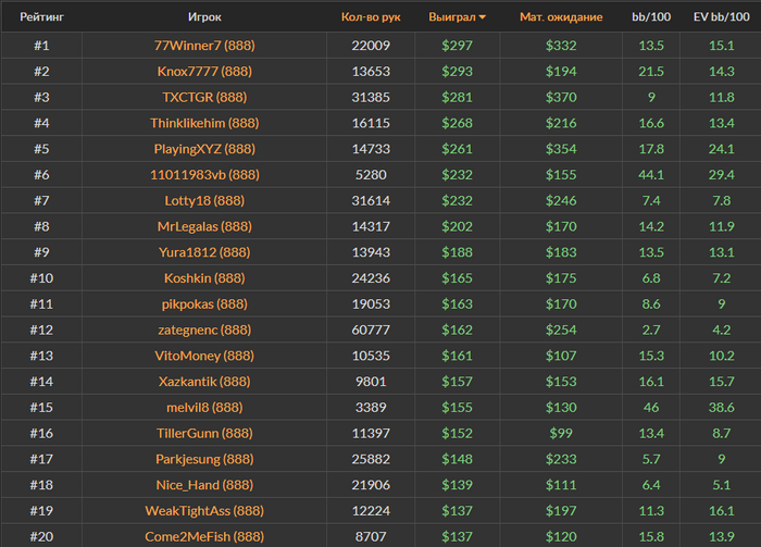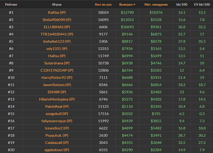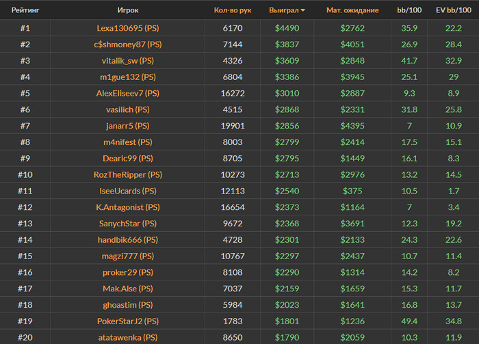 Рейтинг самых успешных игроков за кэш-столами Холдема на PokerStars, ПокерОК, iPoker и 888poker.