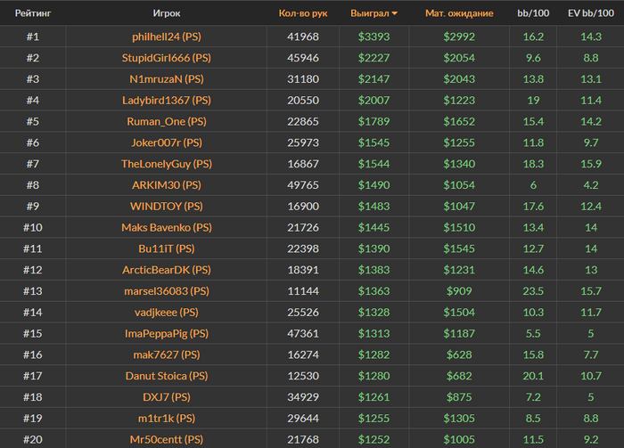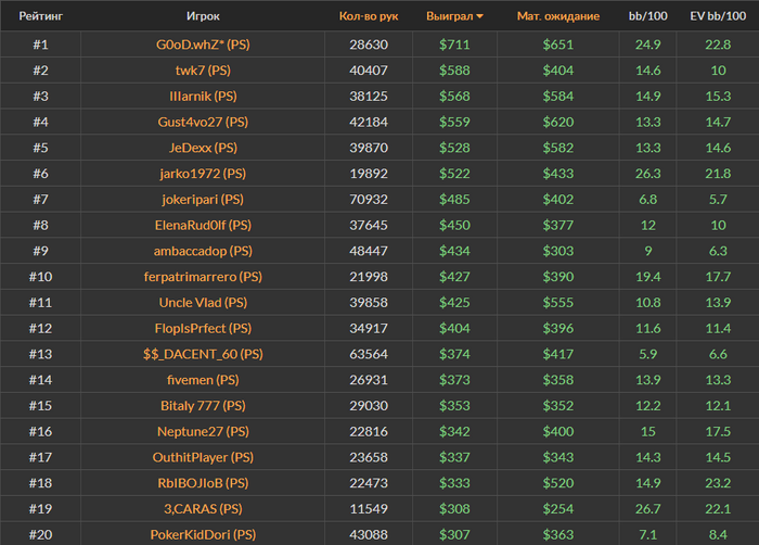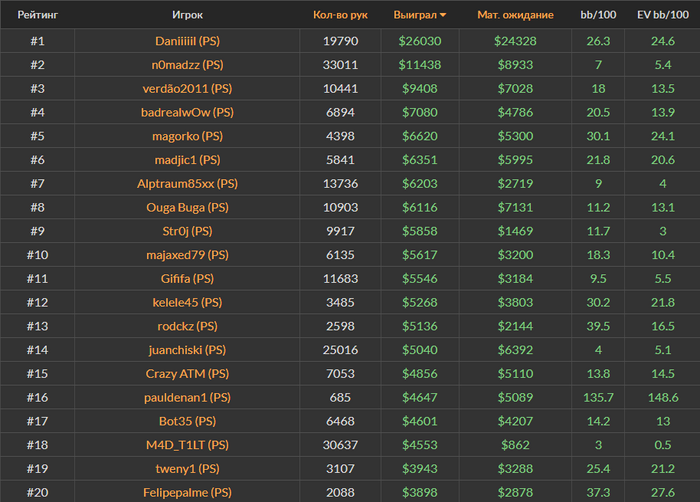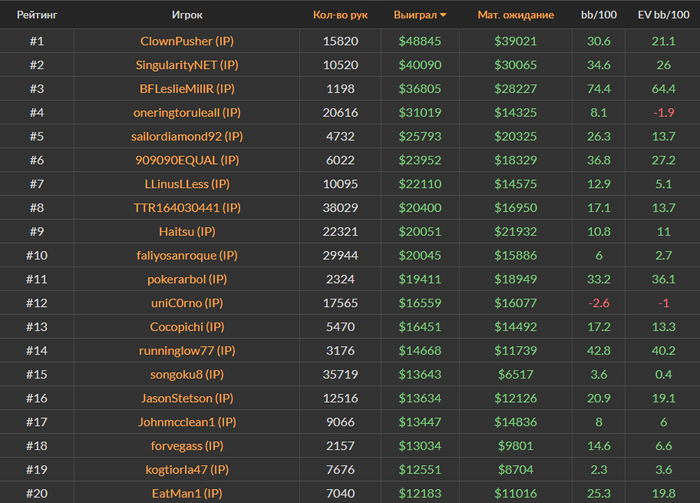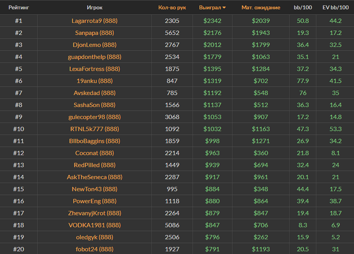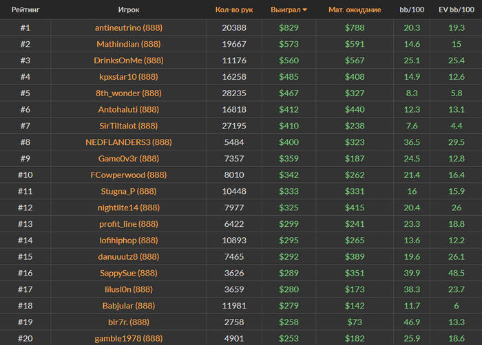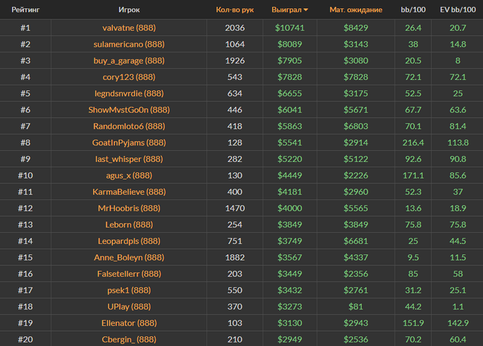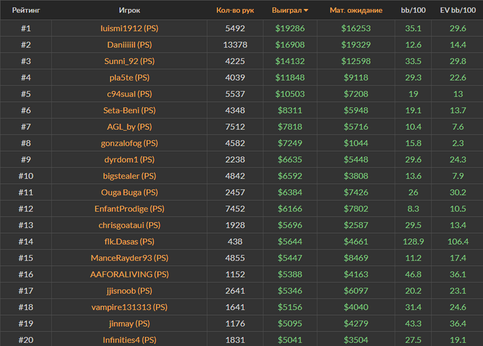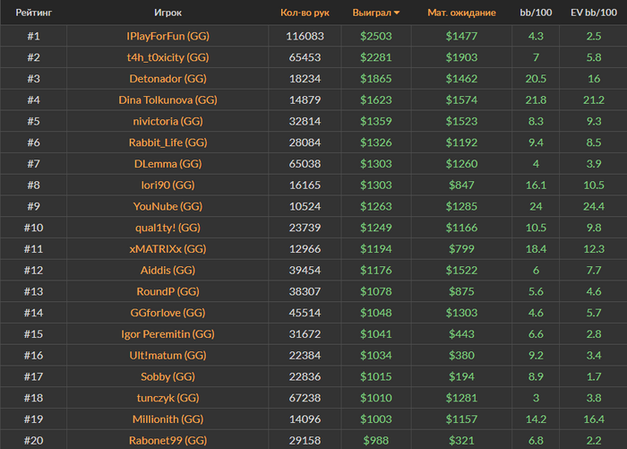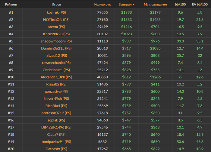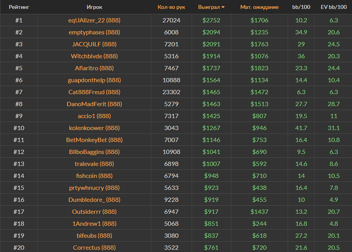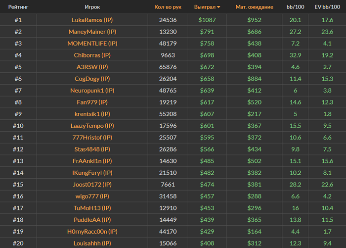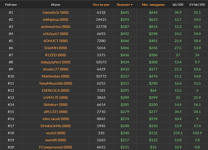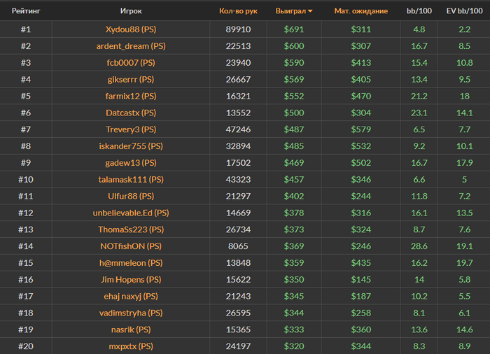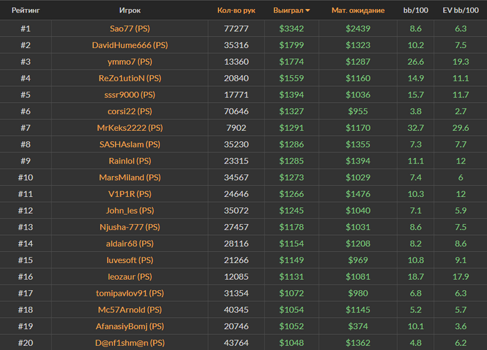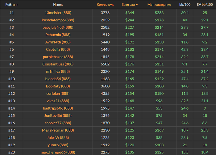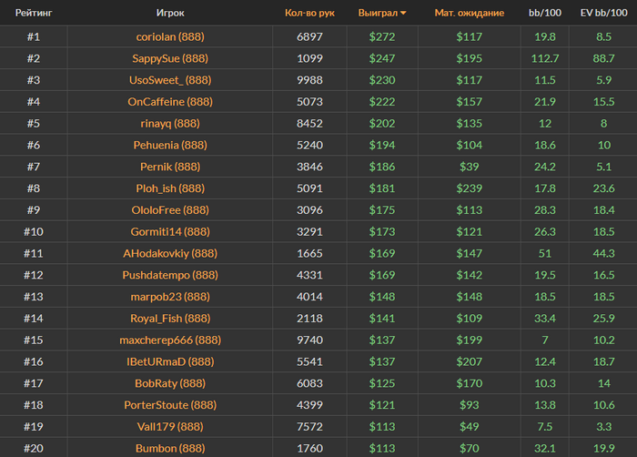 Рейтинг самых успешных игроков за кэш-столами Холдема на PokerStars, ПокерОК, iPoker и 888poker.