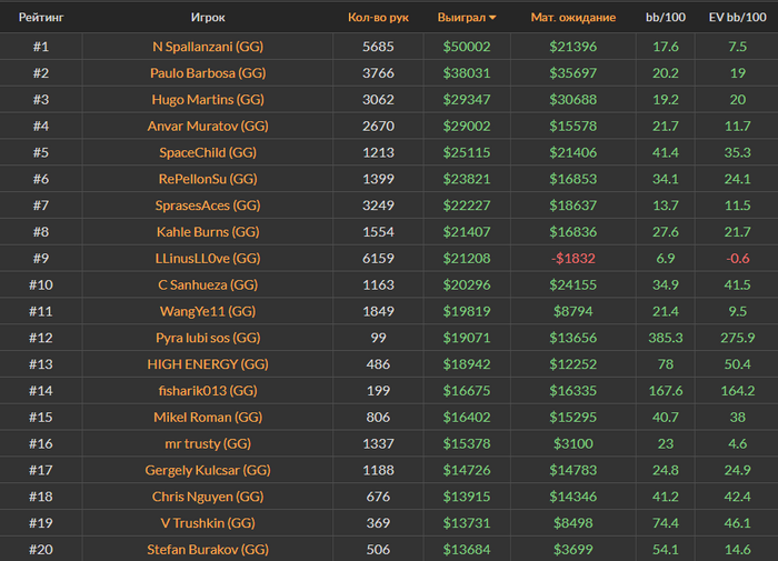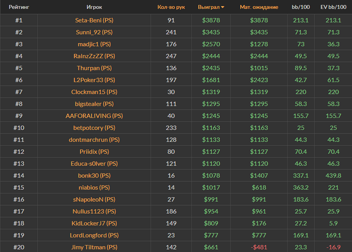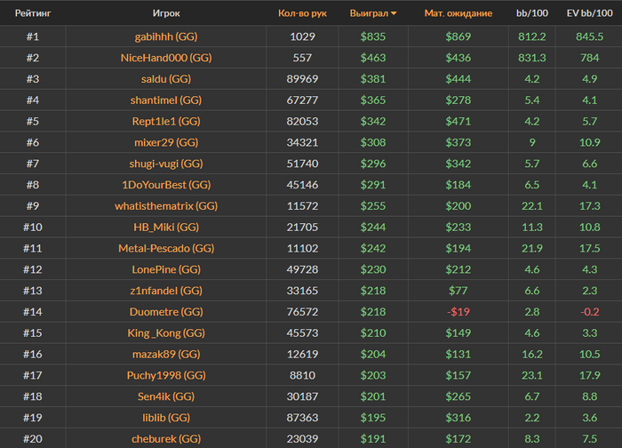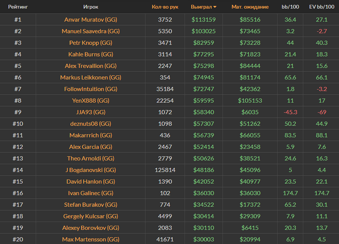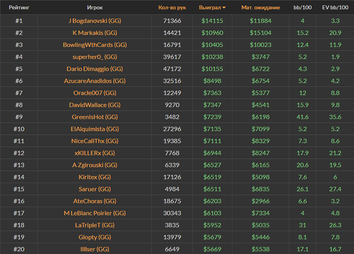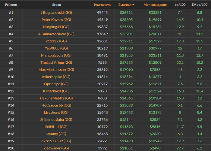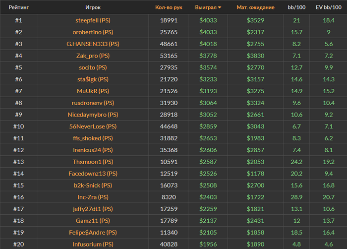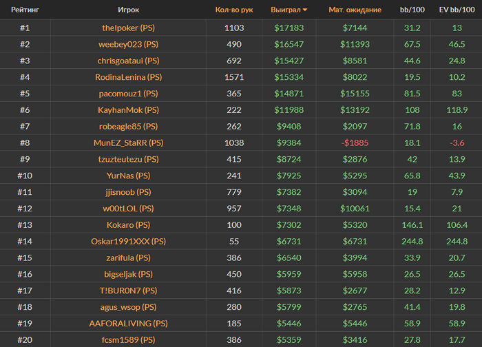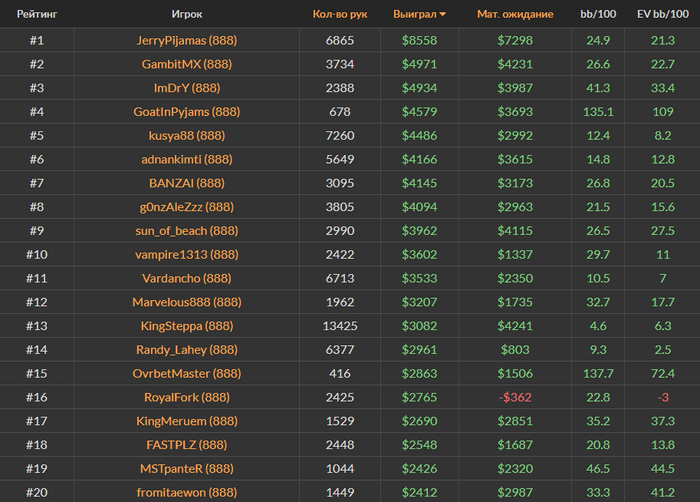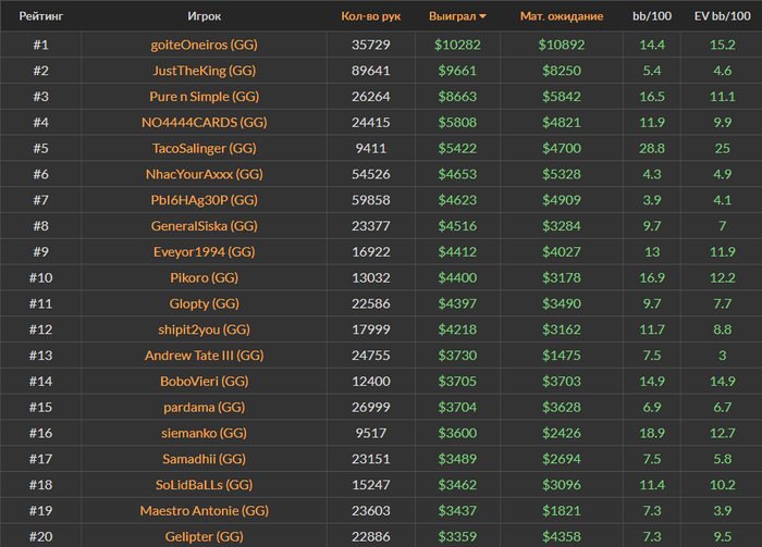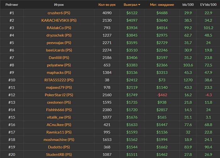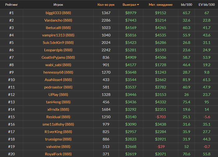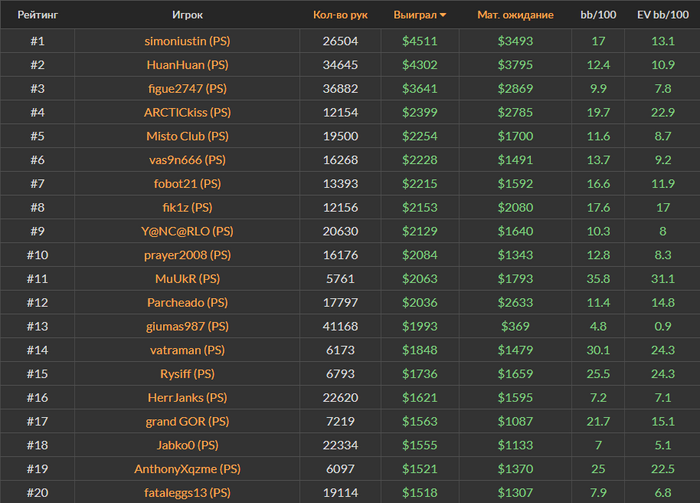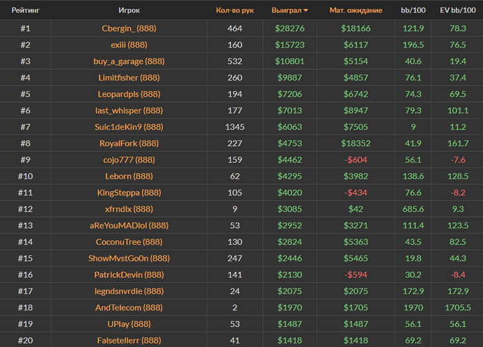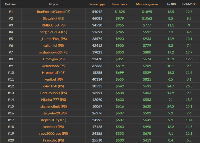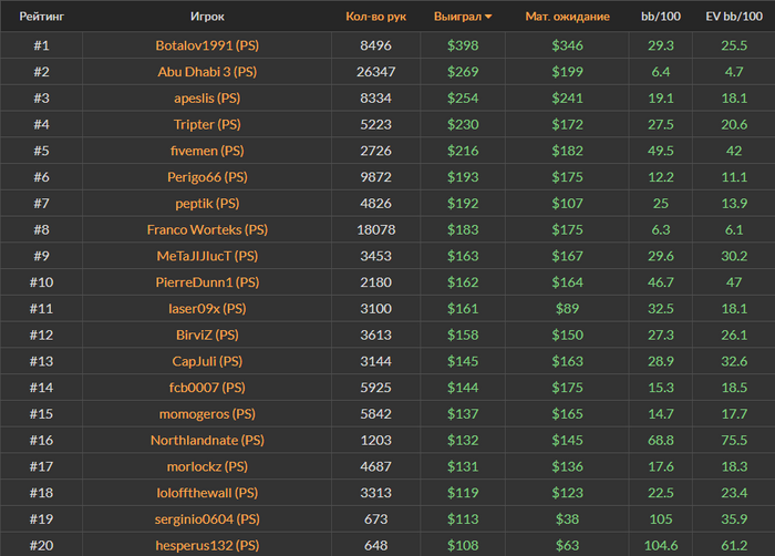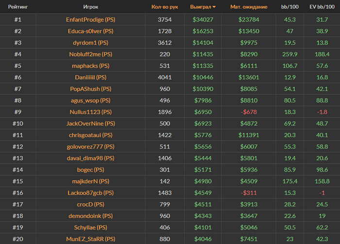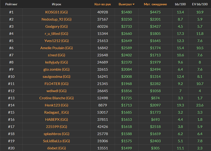 Рейтинг самых успешных игроков за кэш-столами Холдема на PokerStars, ПокерОК, iPoker и 888poker.