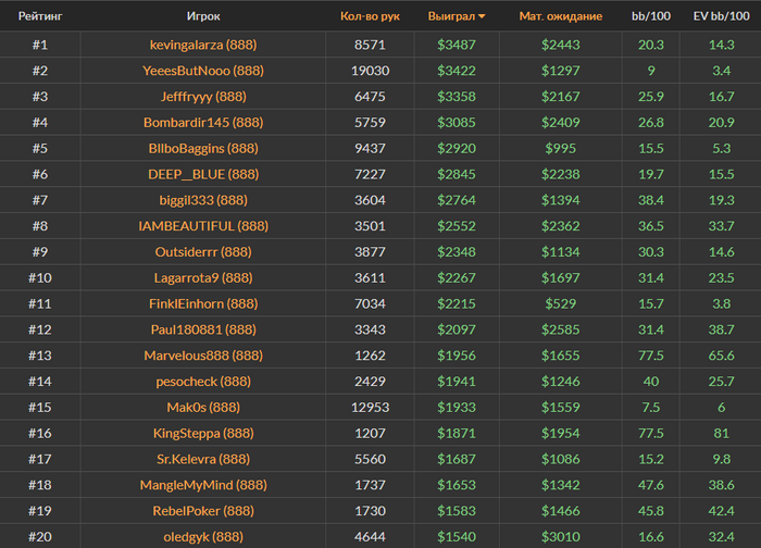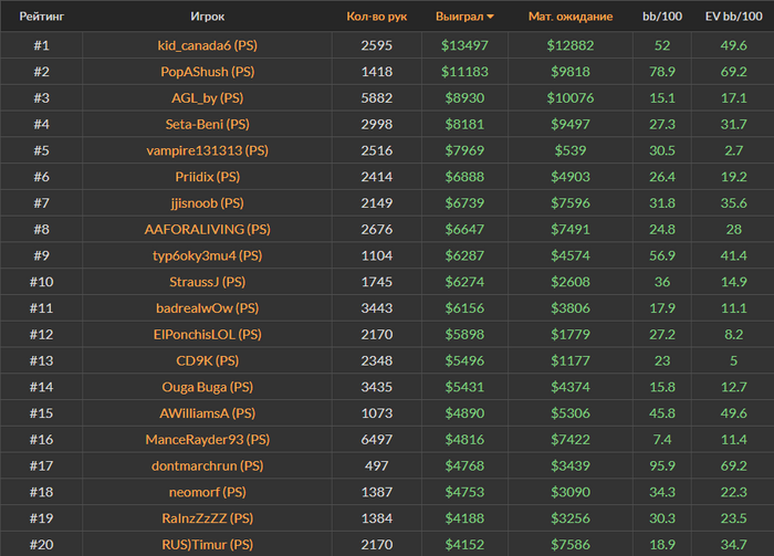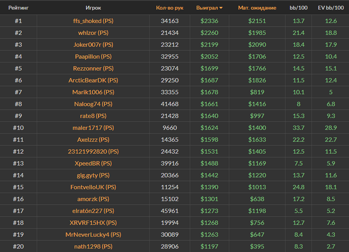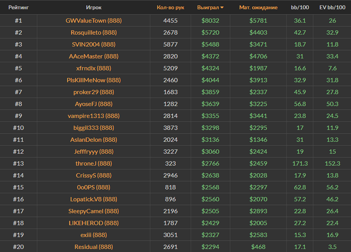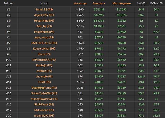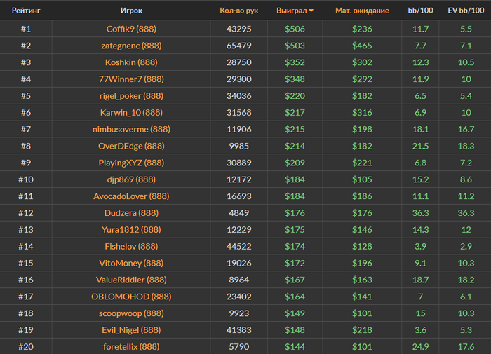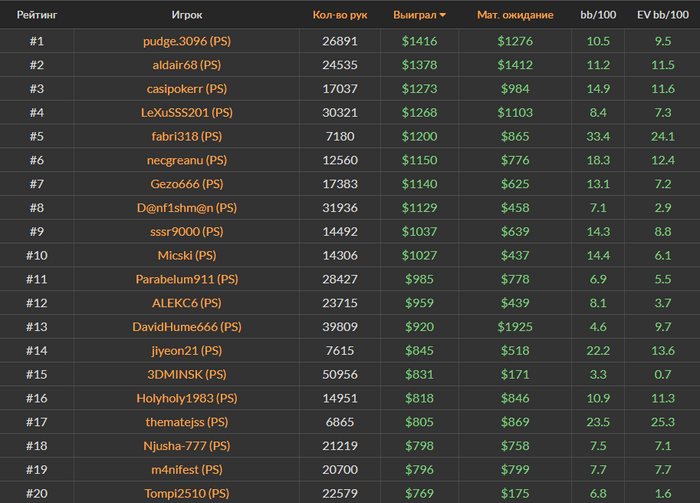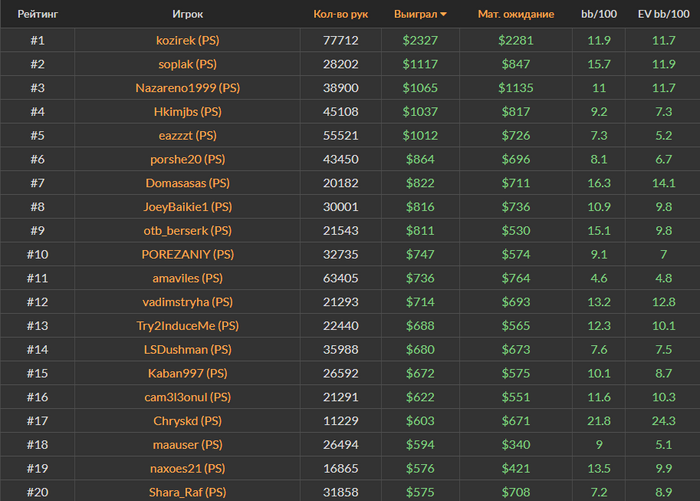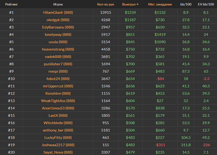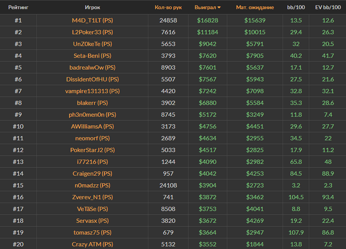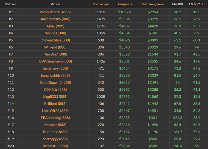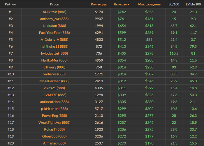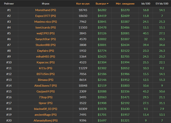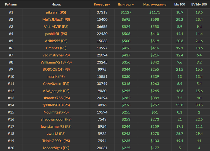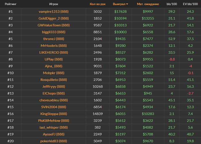 Рейтинг самых плюсовых покеристов в кэше в Безлимитном холдеме на PokerStars, ПокерОК и 888poker.