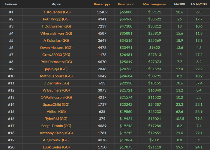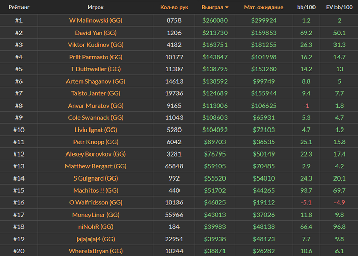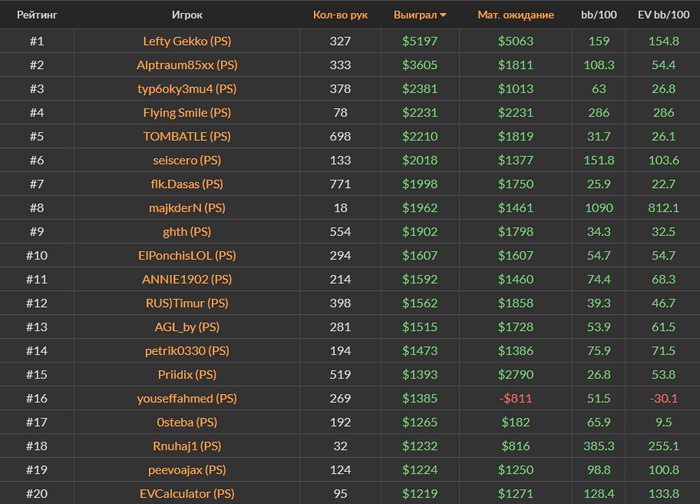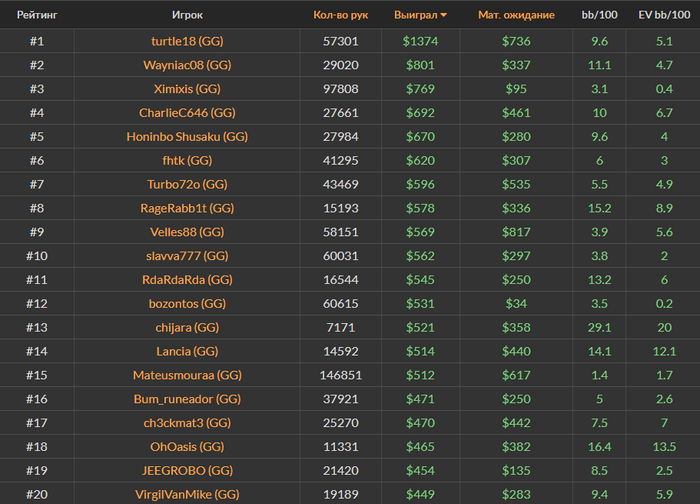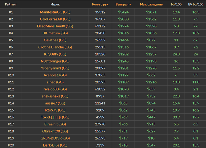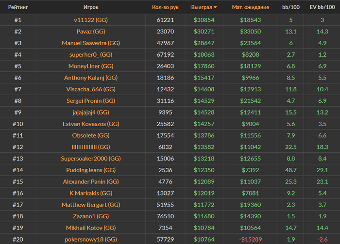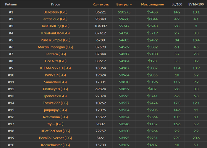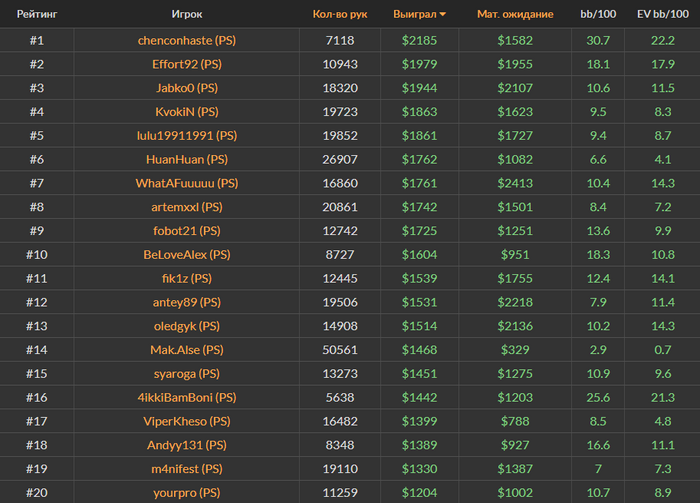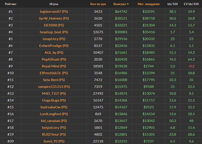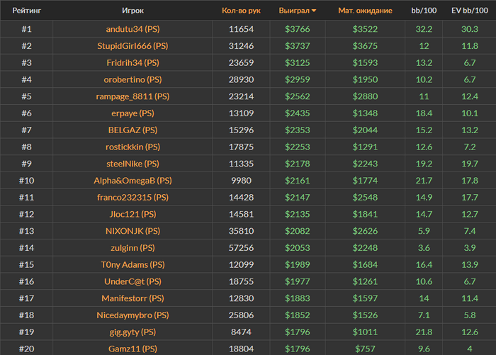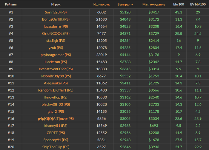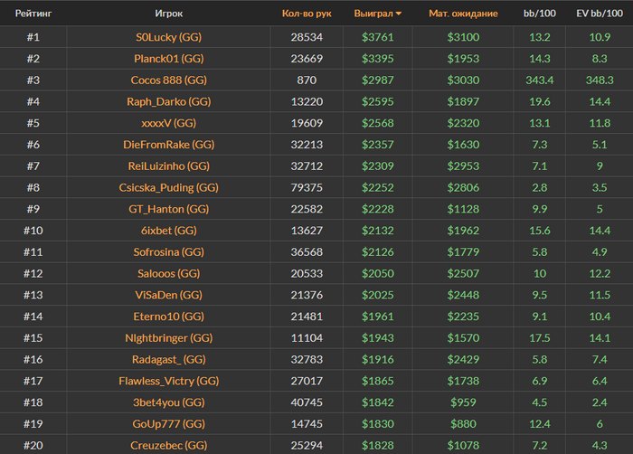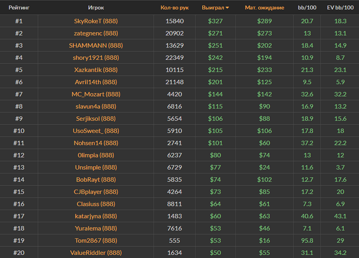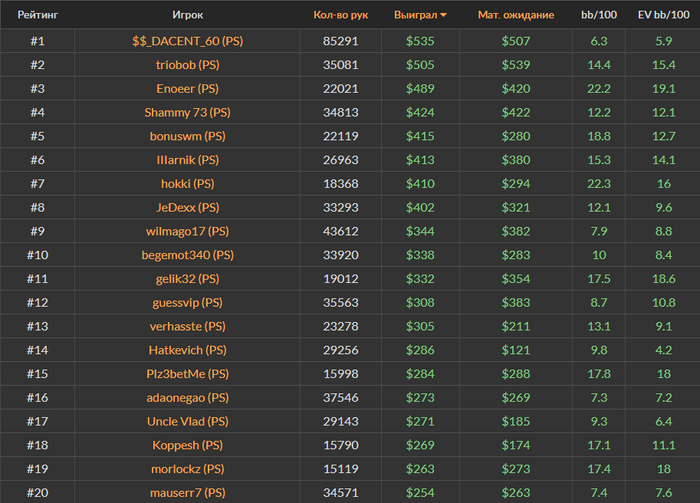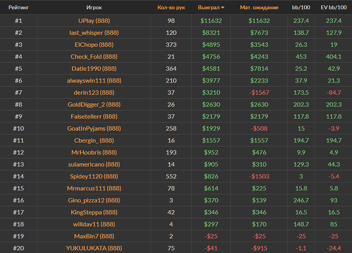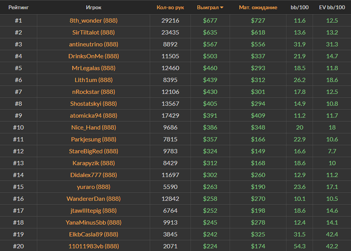Рейтинг самых плюсовых покеристов в кэше в Безлимитном холдеме на PokerStars, ПокерОК и 888poker.