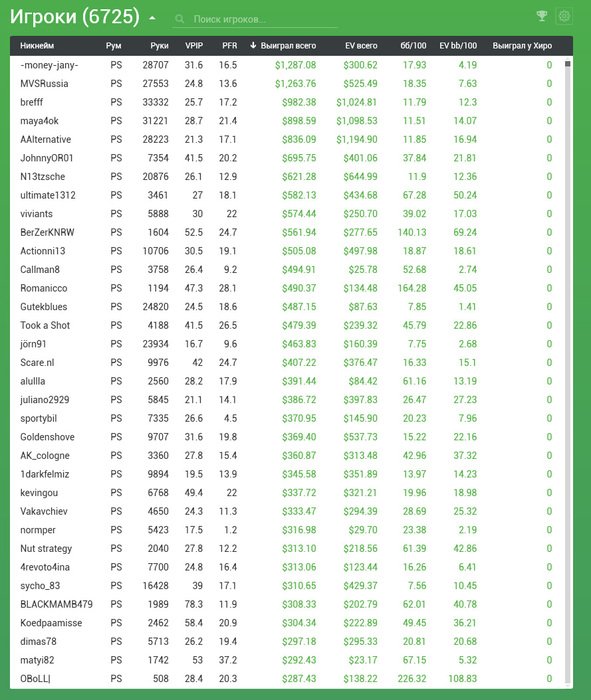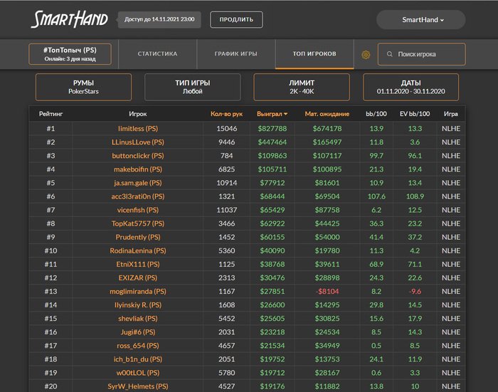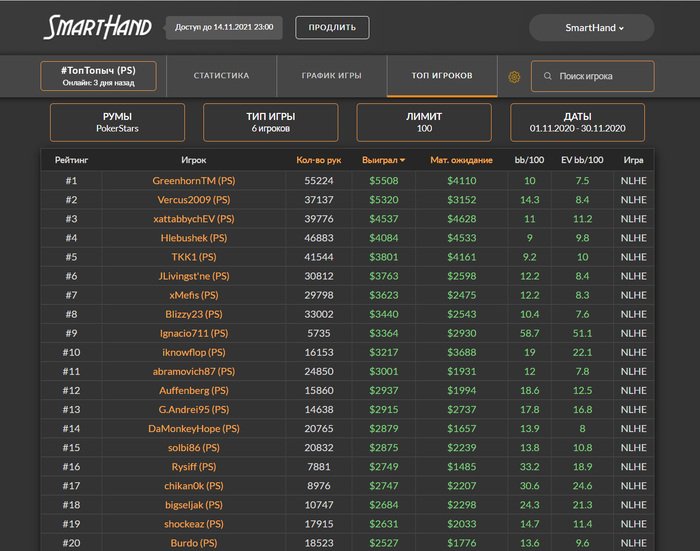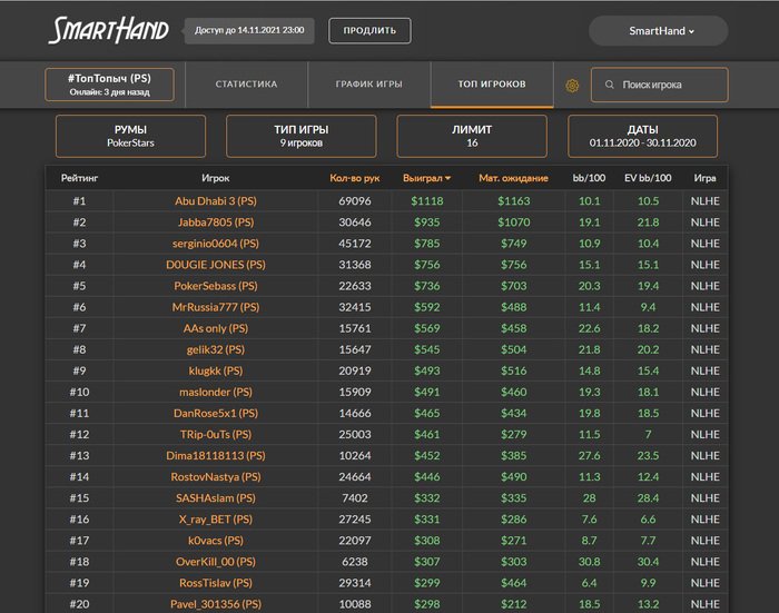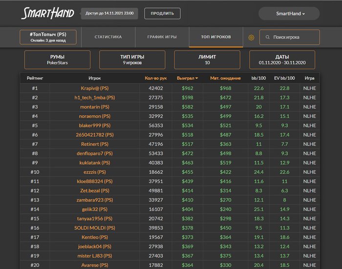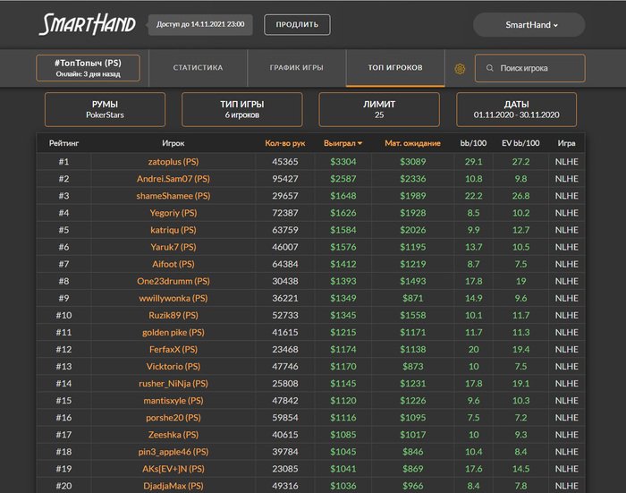 Топ-20 кэш-игроков за ноябрь текущего года в безлимитном холдеме и пот-лимит омахе на PokerStars.
