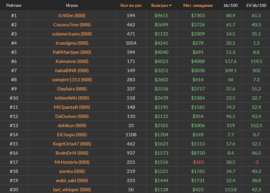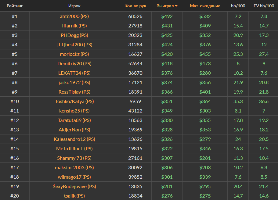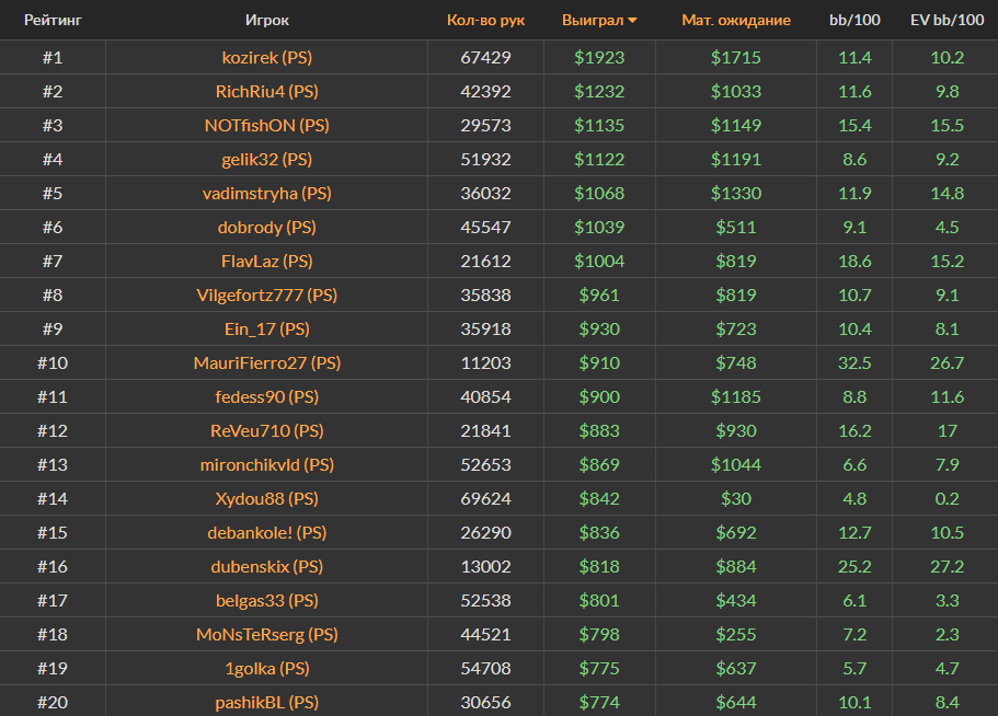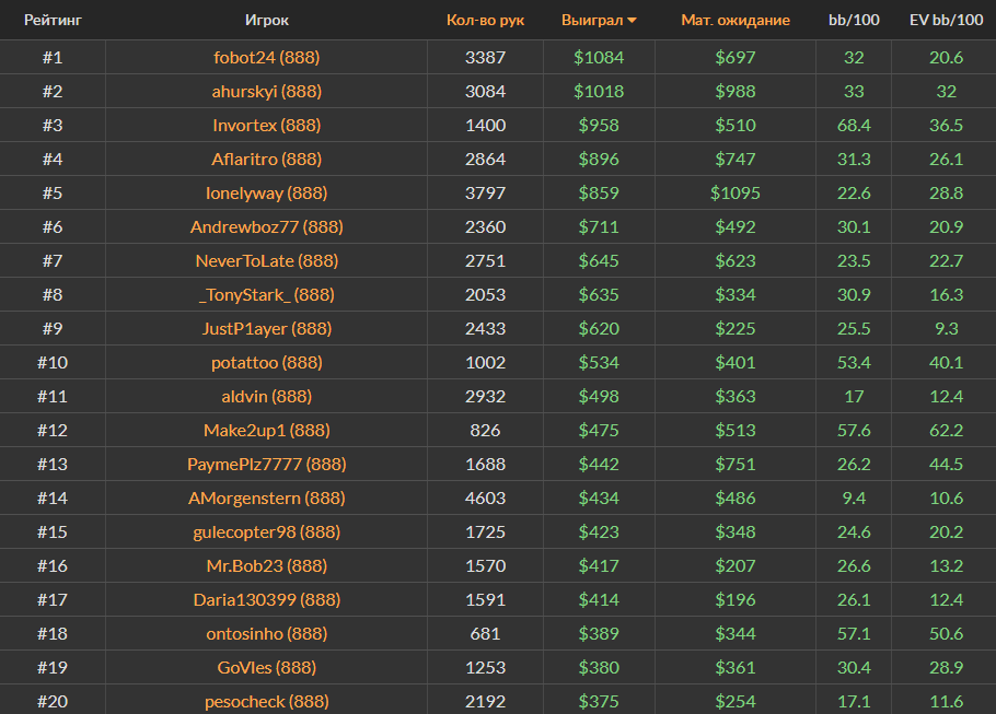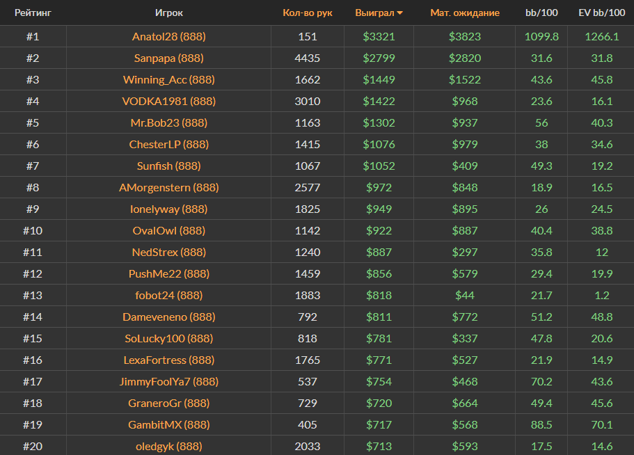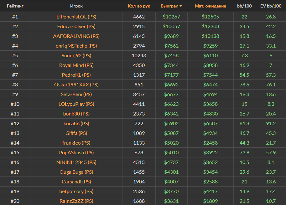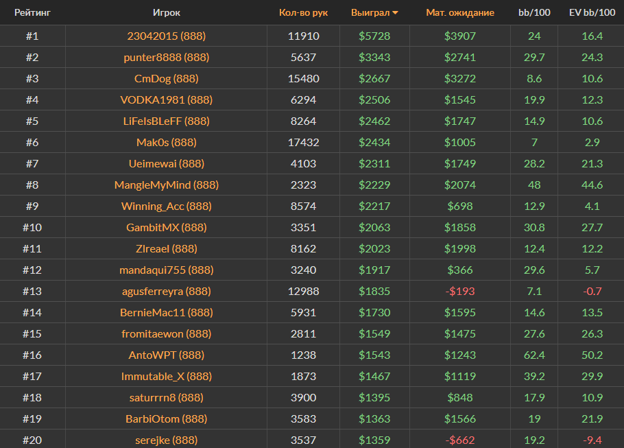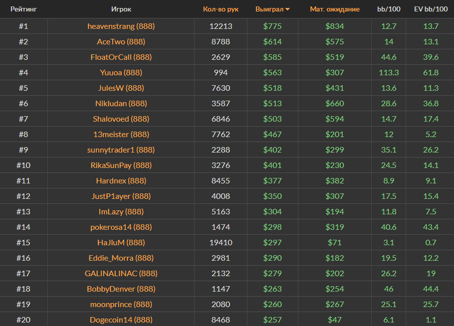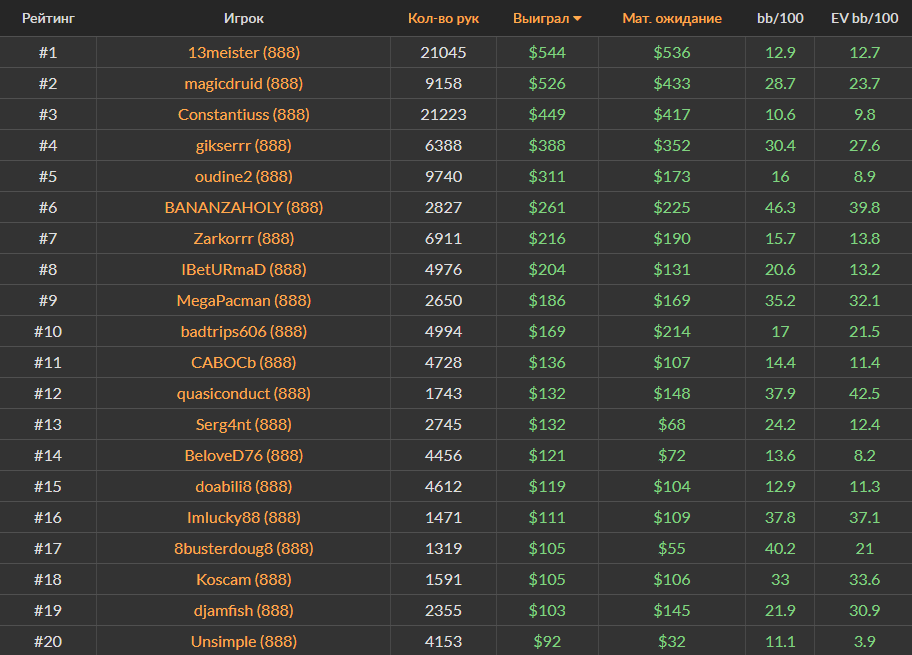 Ноябрьский Топ-20 самых успешных игроков за кэш-столами Холдема на PokerStars, ПокерОК и 888poker.