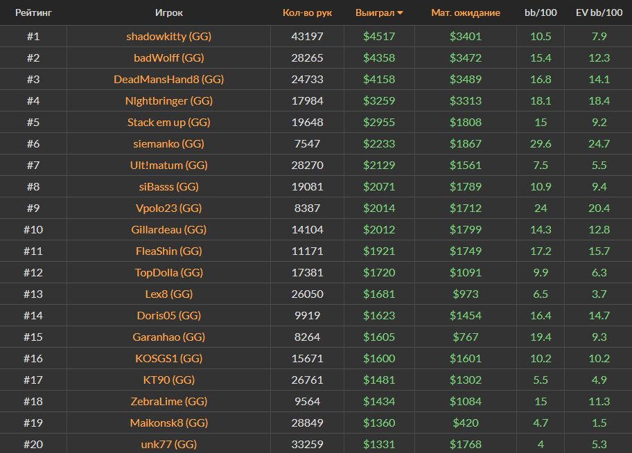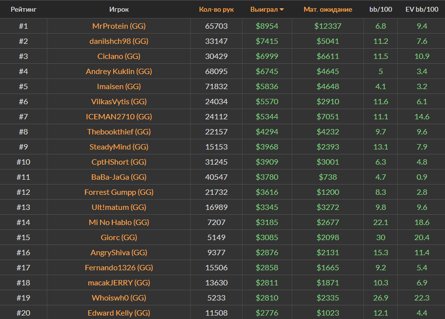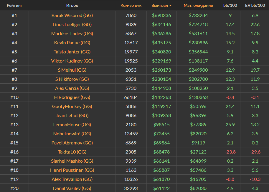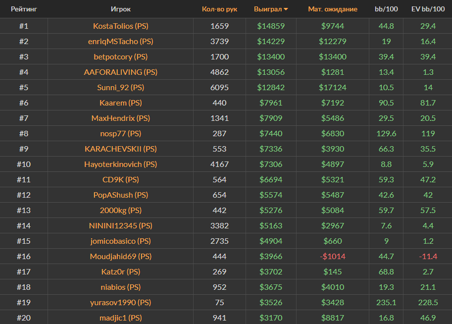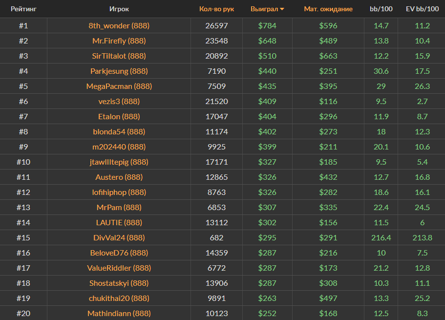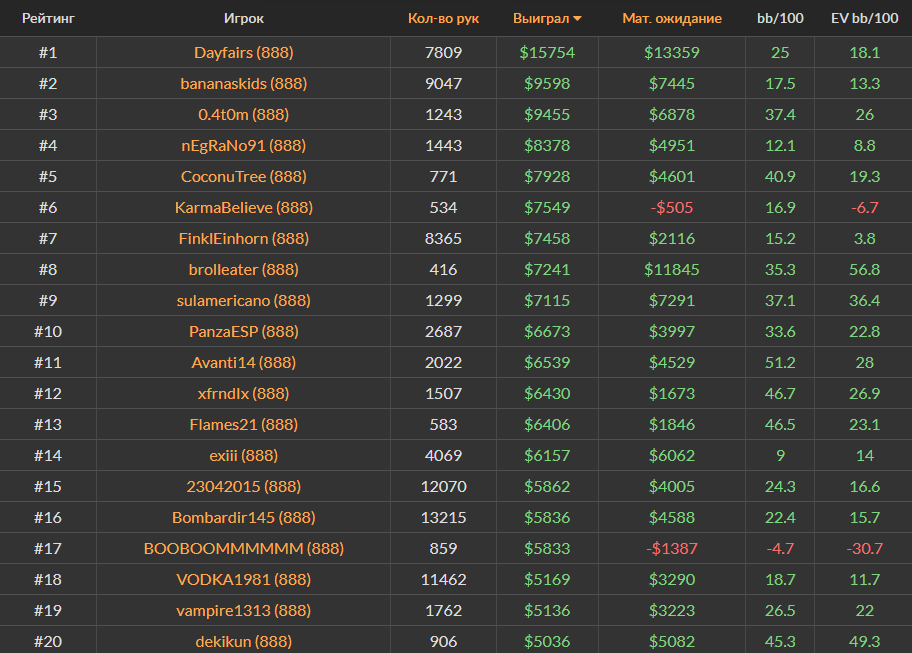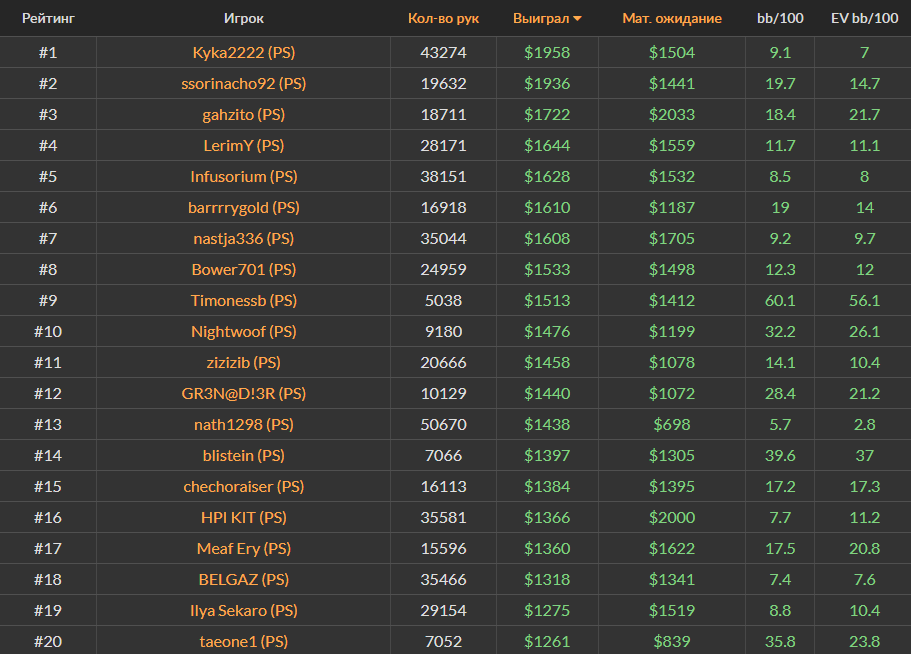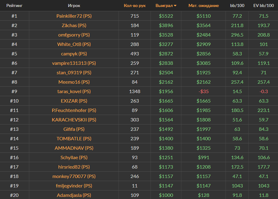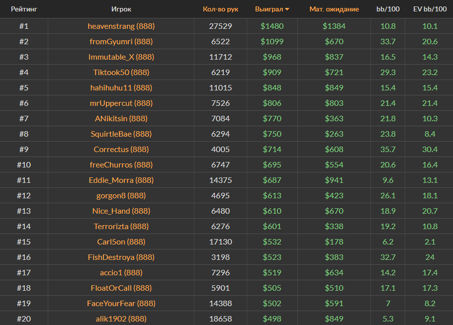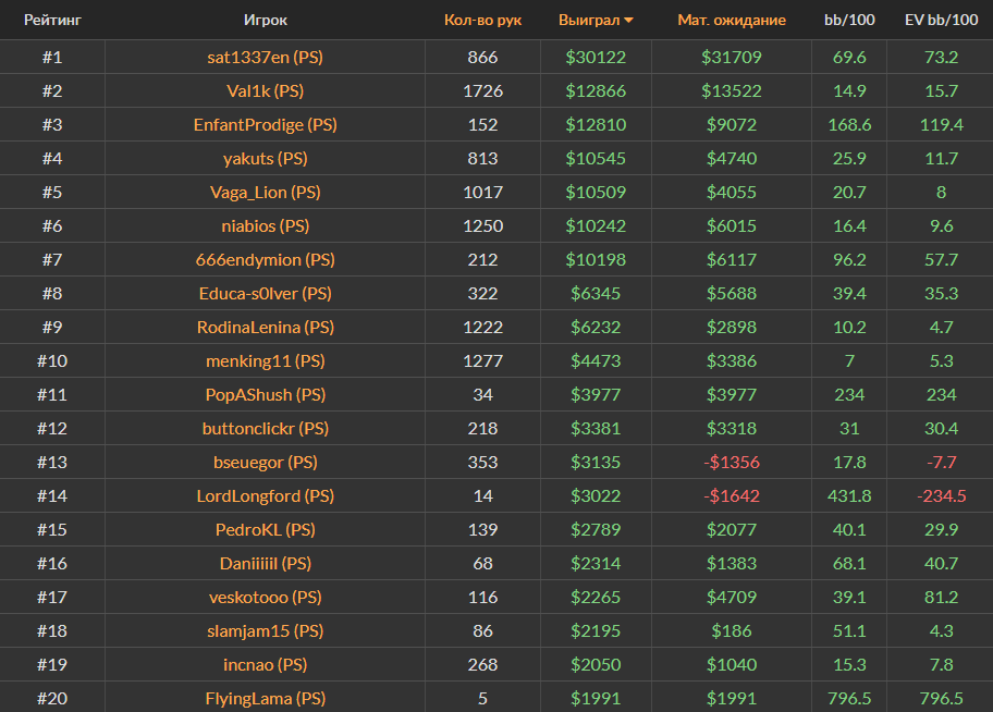 Ноябрьский Топ-20 самых успешных игроков за кэш-столами Холдема на PokerStars, ПокерОК и 888poker.