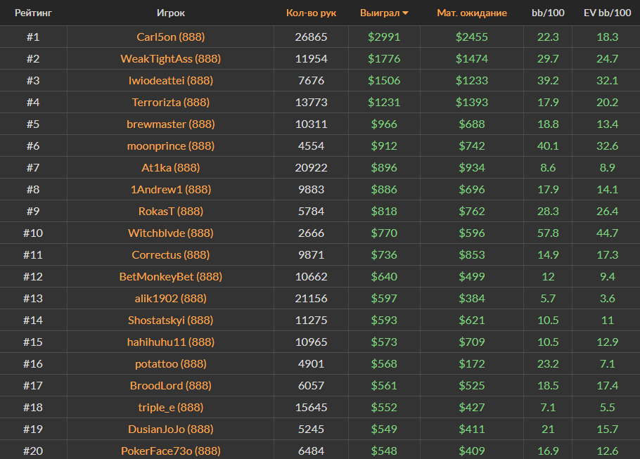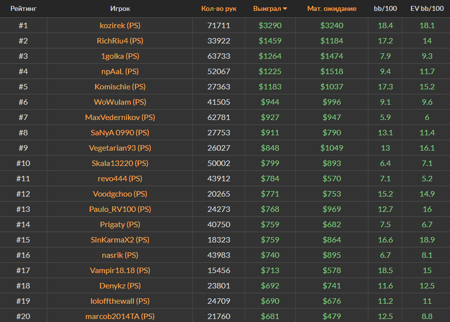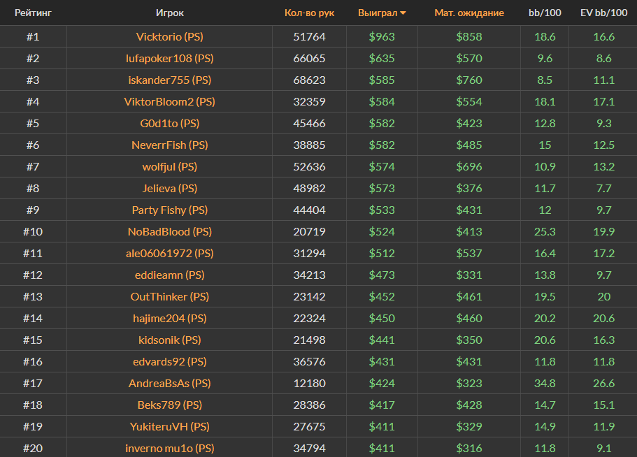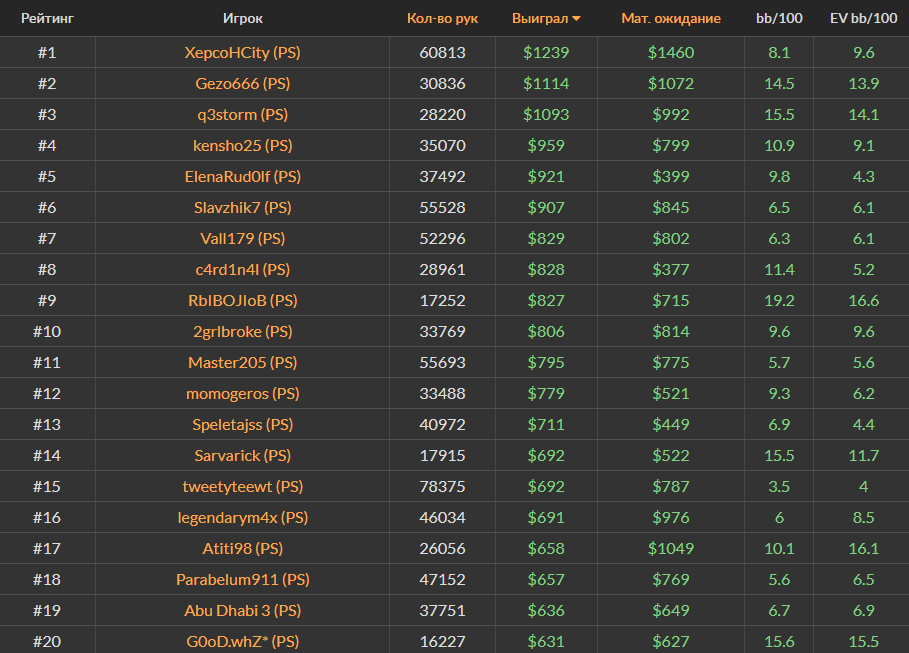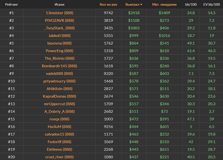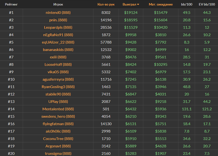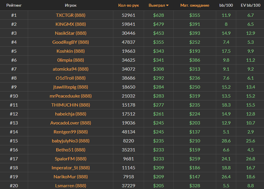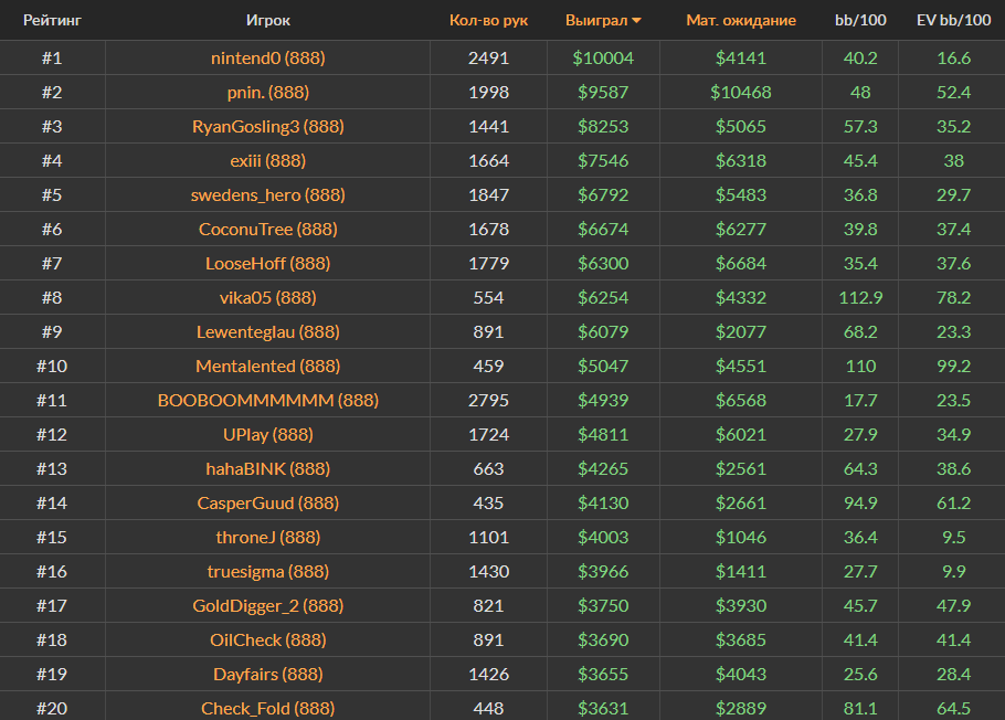 Рейтинг самых плюсовых покеристов в кэше за столами Безлимитного холдема на PokerStars, ПокерОК и 888poker.