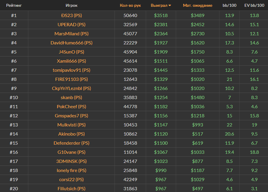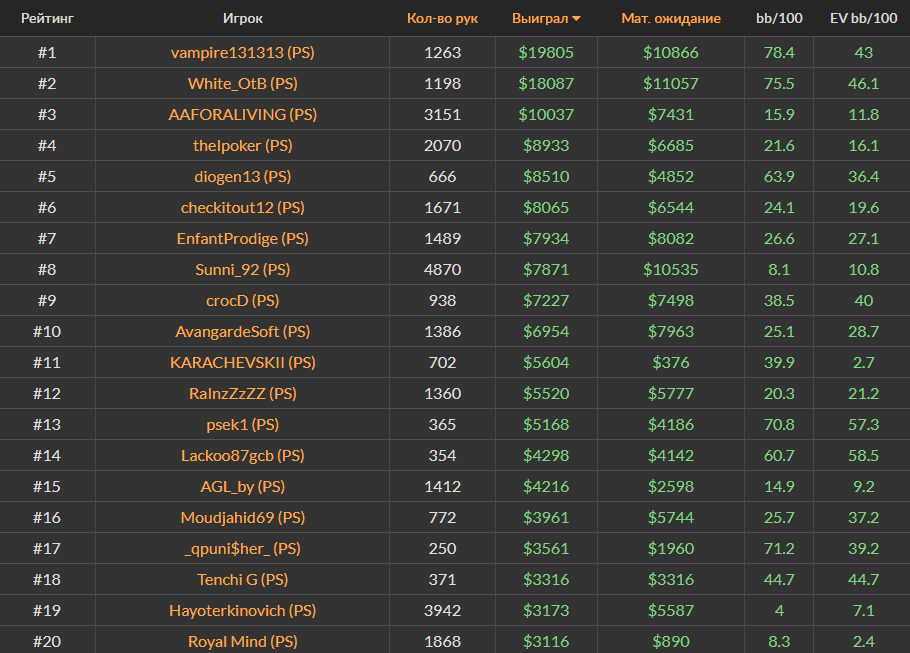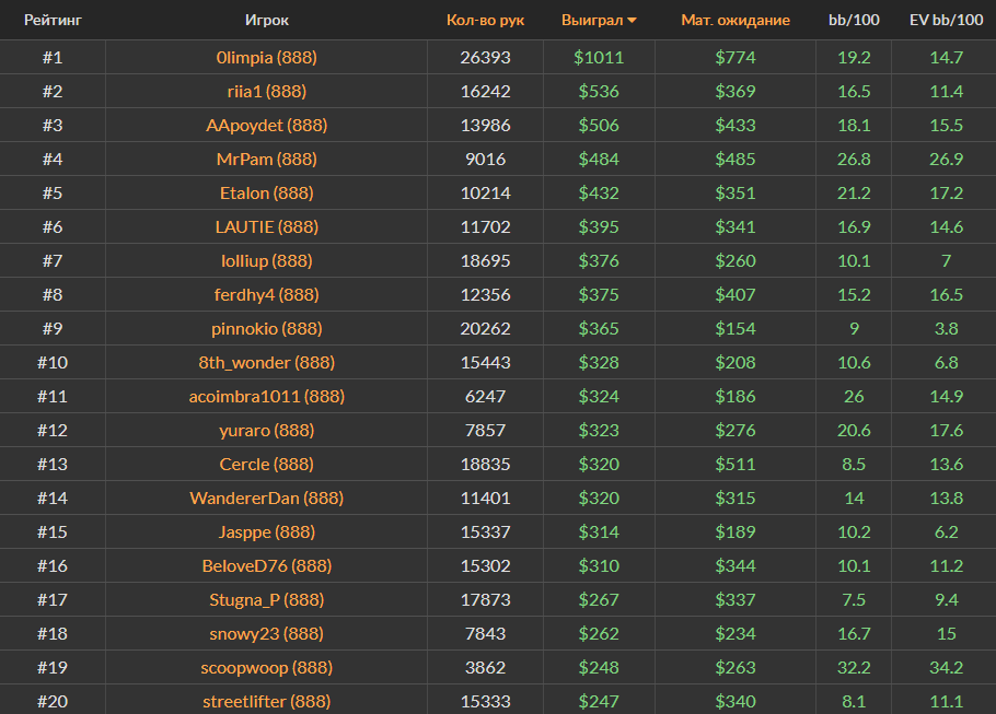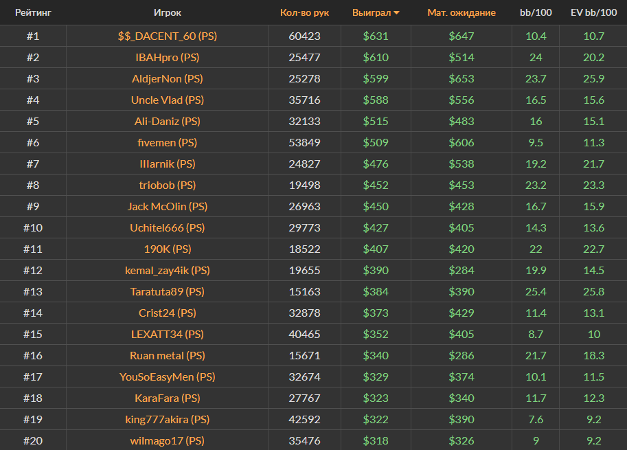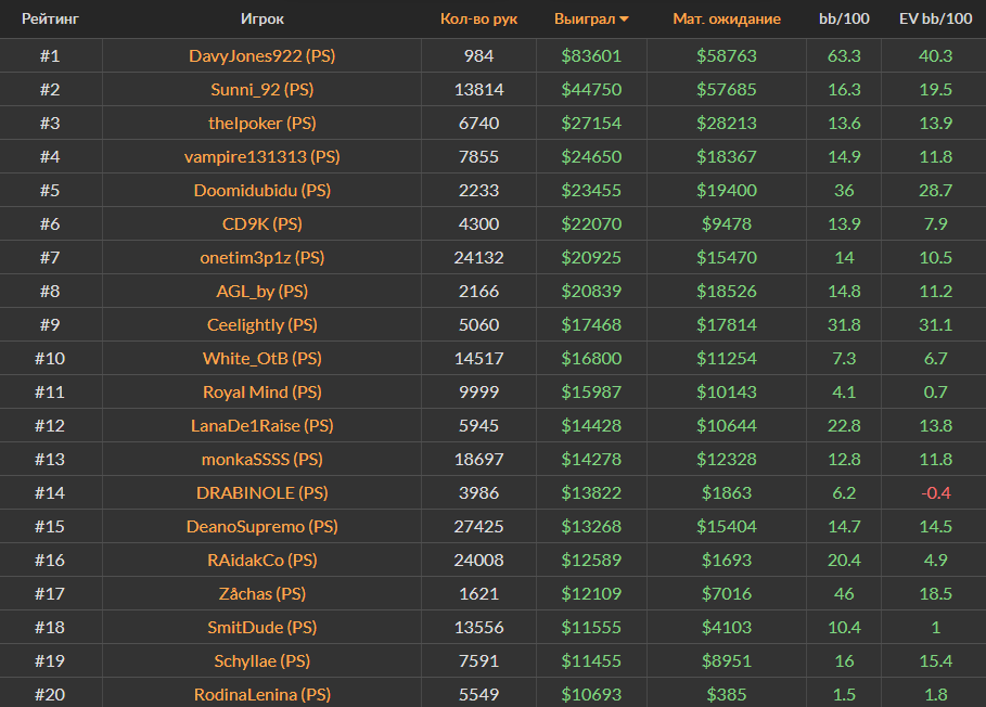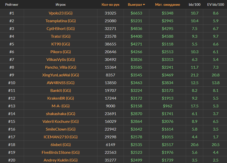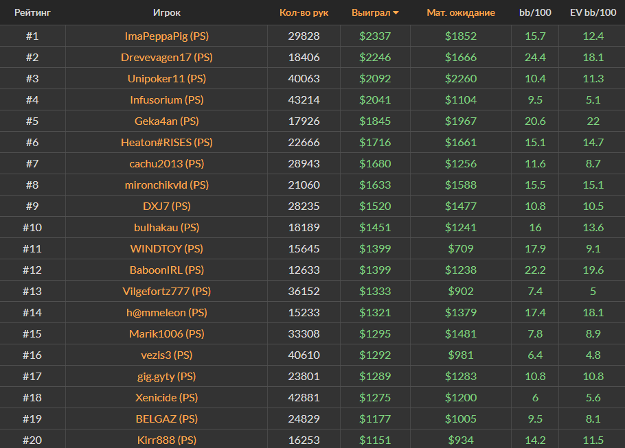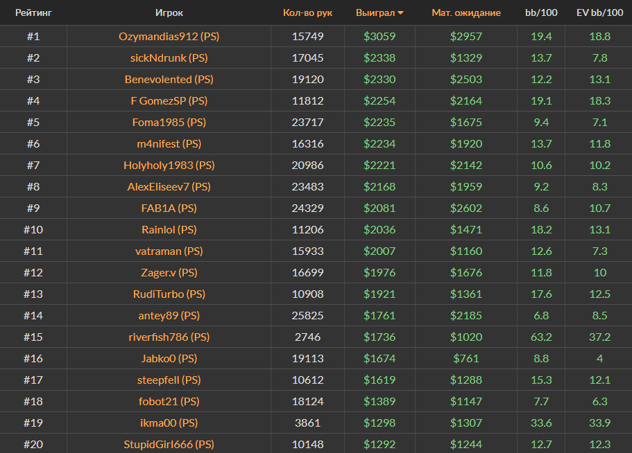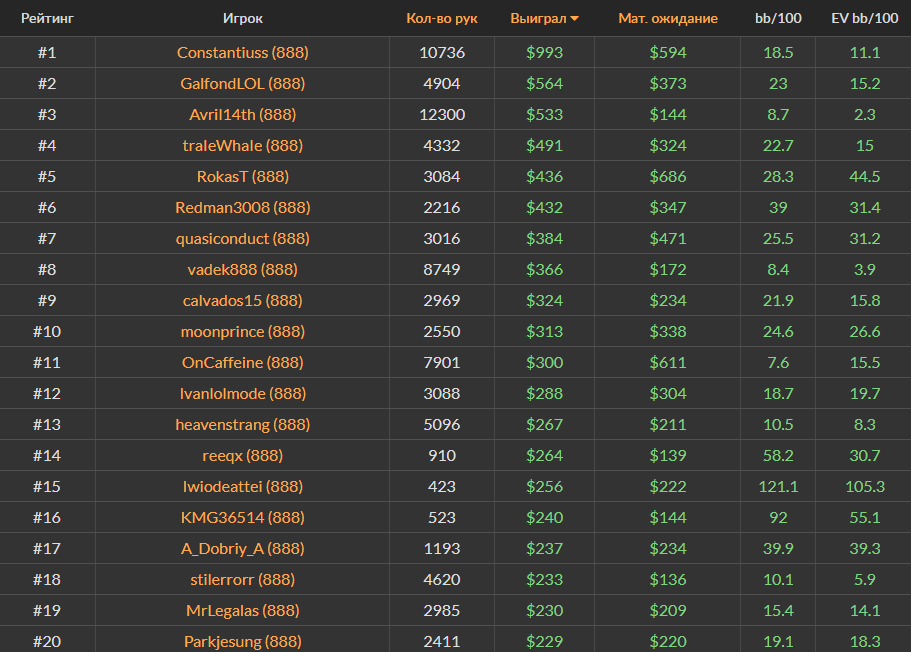 Рейтинг самых плюсовых покеристов в кэше за столами Безлимитного холдема на PokerStars, ПокерОК и 888poker.