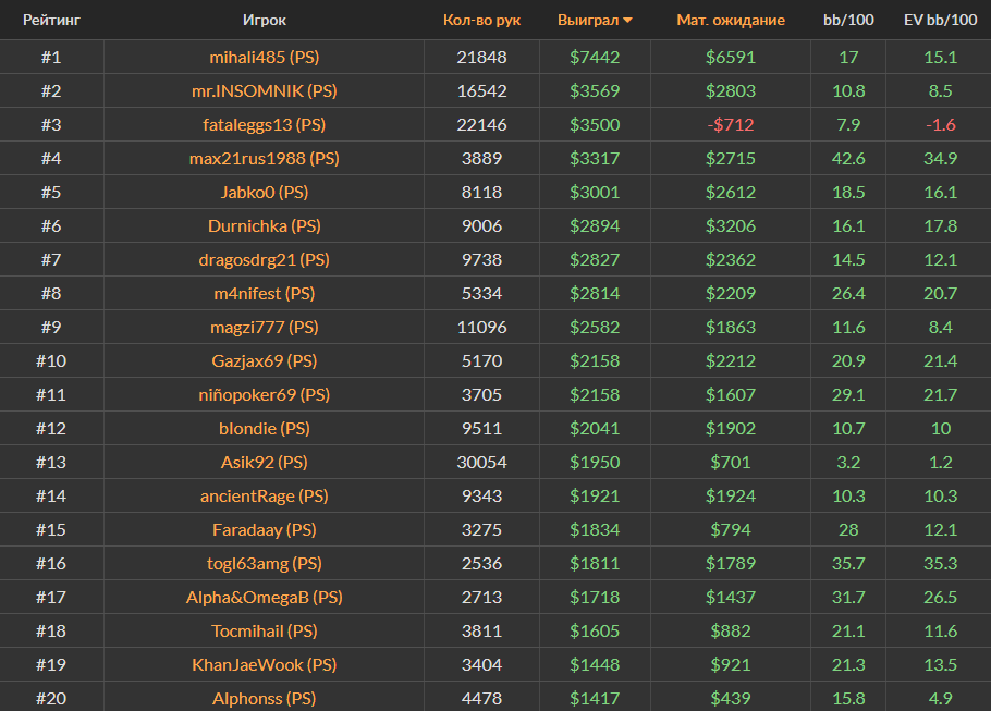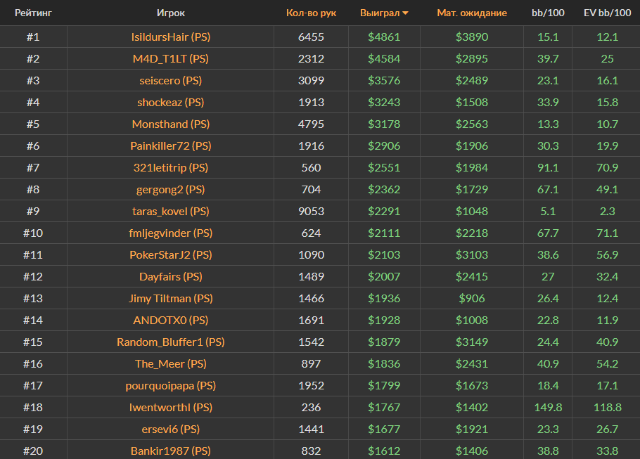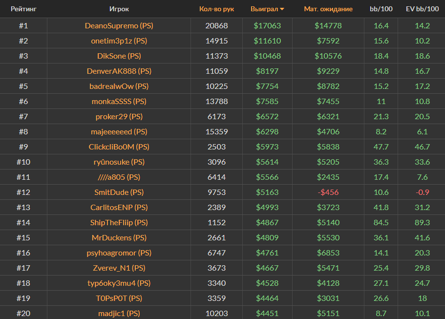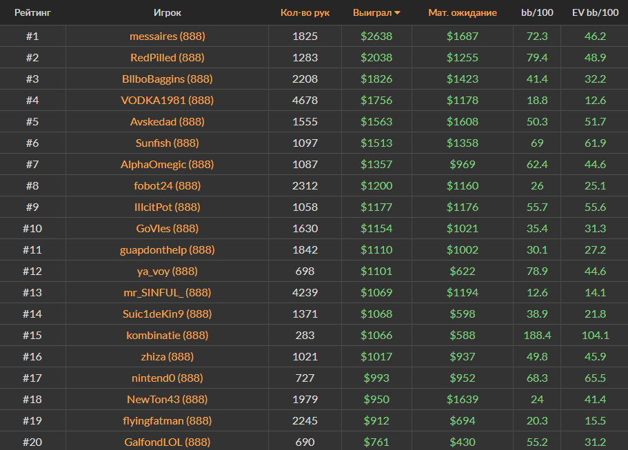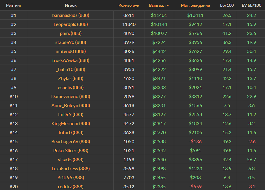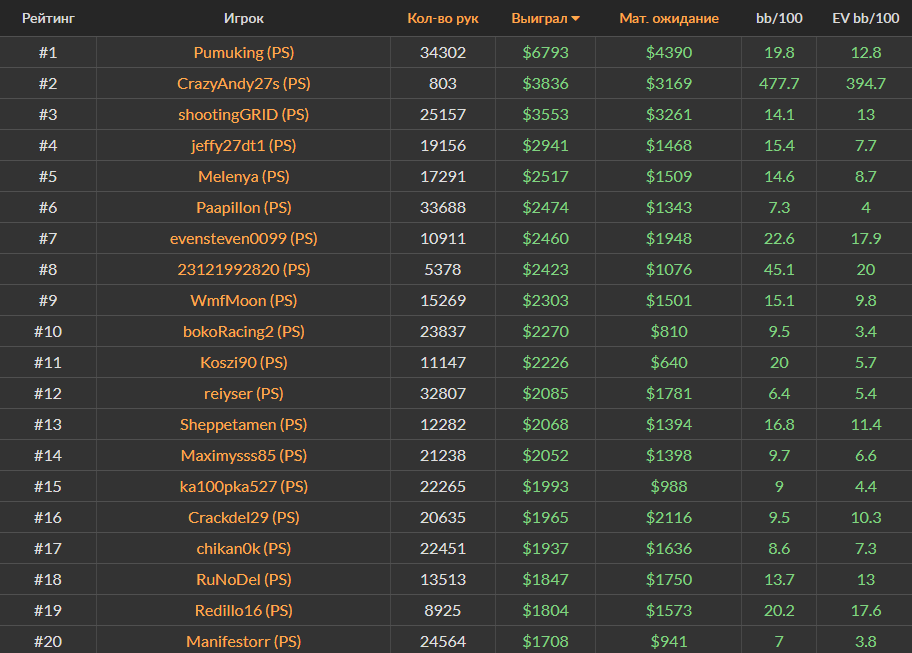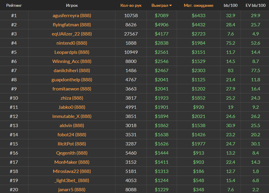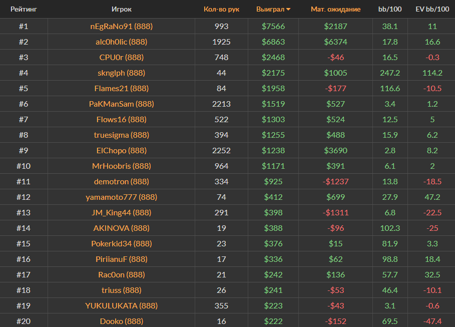 Рейтинг самых плюсовых покеристов в кэше за столами Безлимитного холдема на PokerStars, ПокерОК и 888poker.