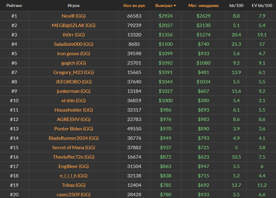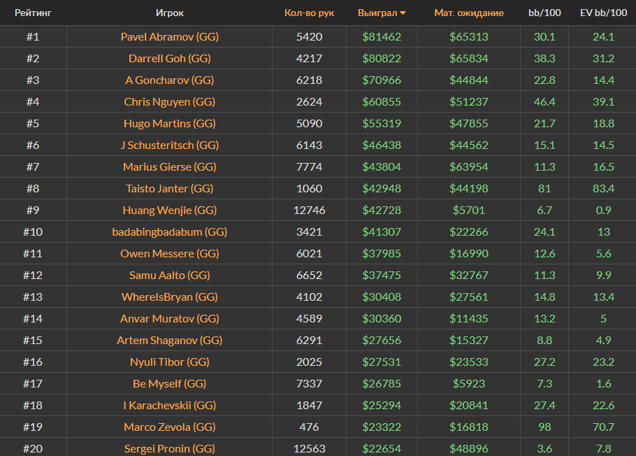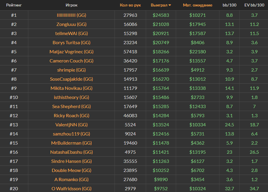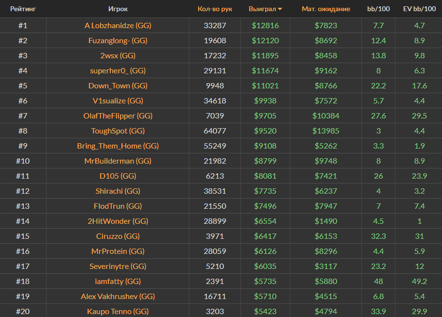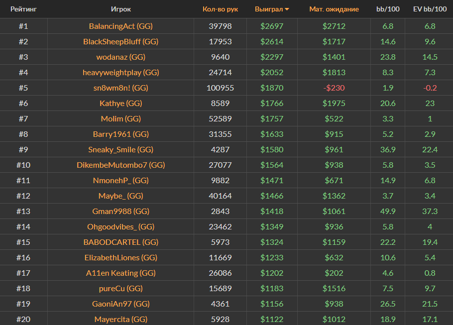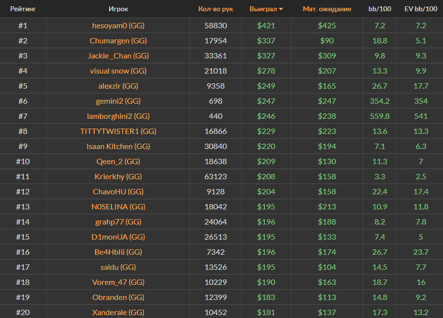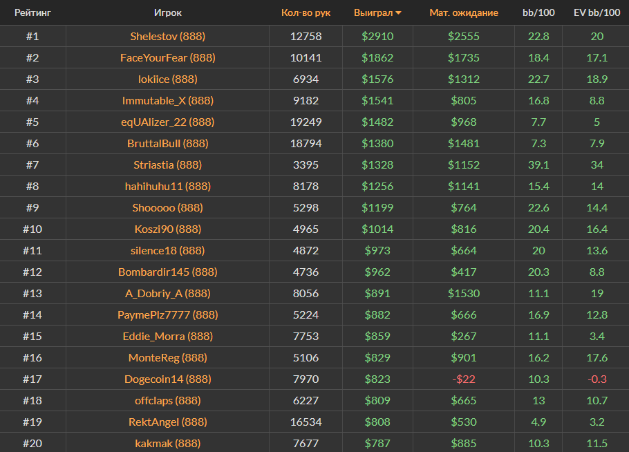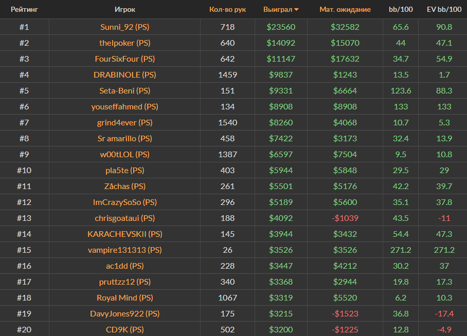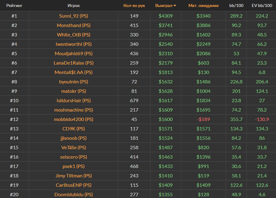 Рейтинг самых плюсовых покеристов в кэше за столами Безлимитного холдема на PokerStars, ПокерОК и 888poker.