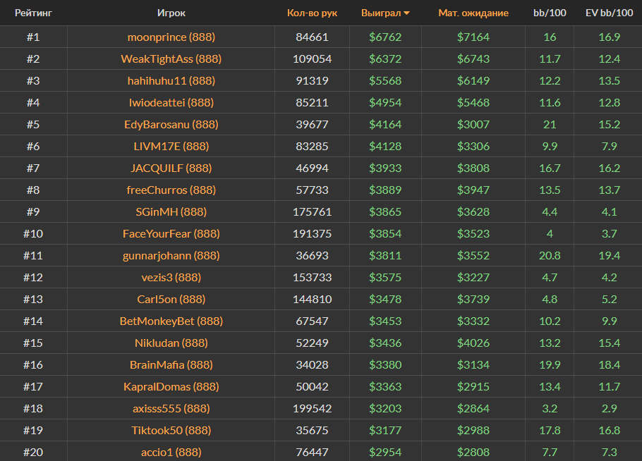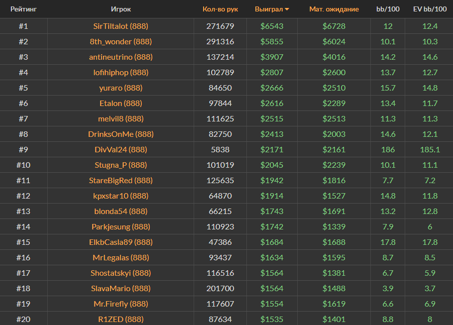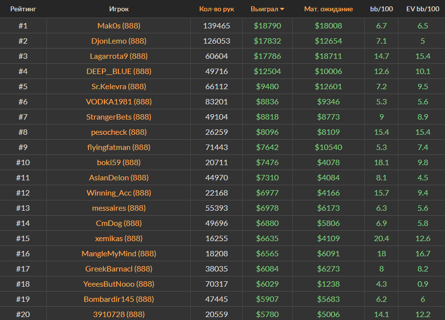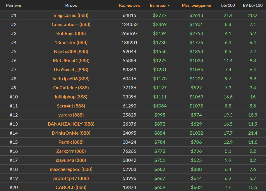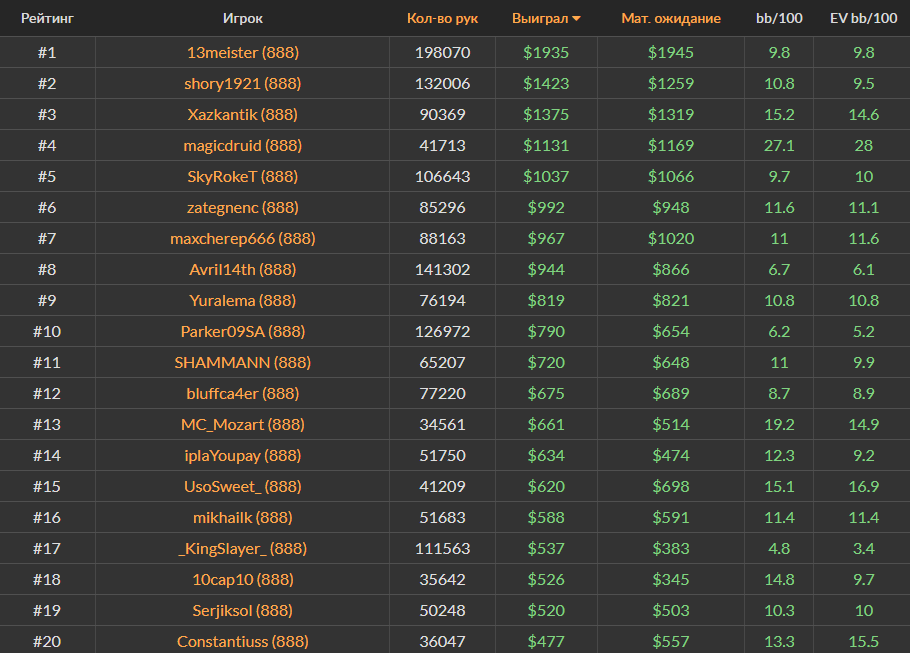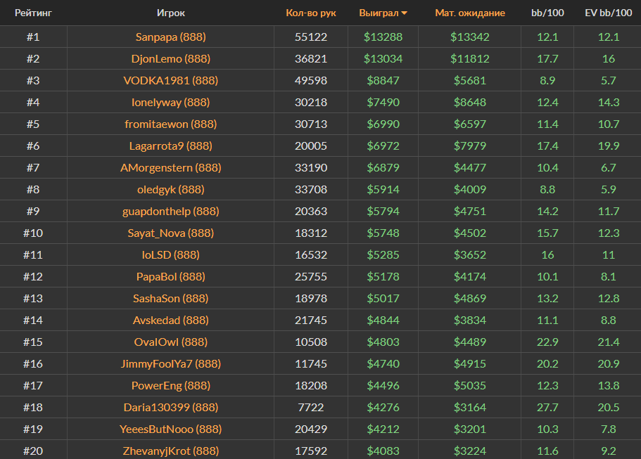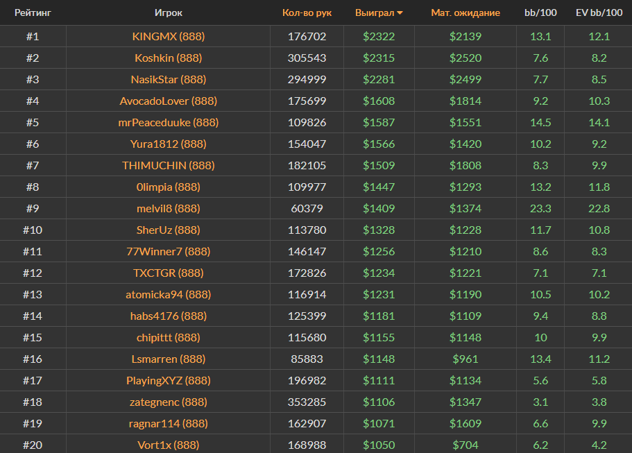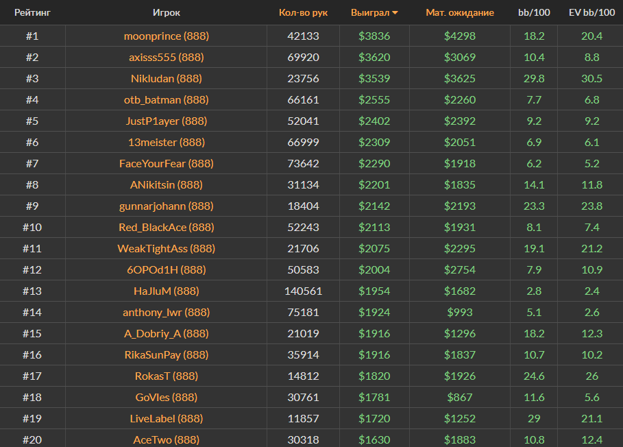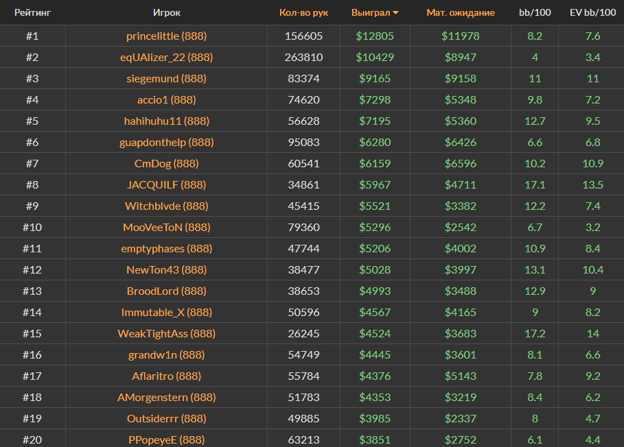 Самые успешные игроки за кэш-столами Холдема за весь предыдущий год на PokerStars, ПокерОК и 888poker.