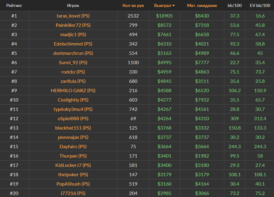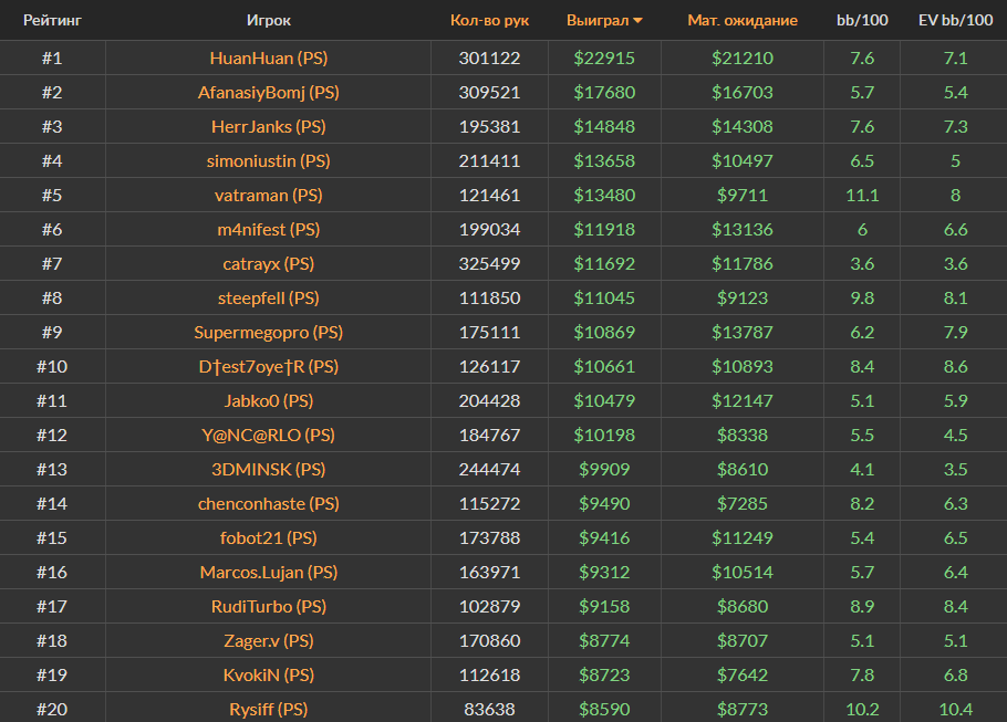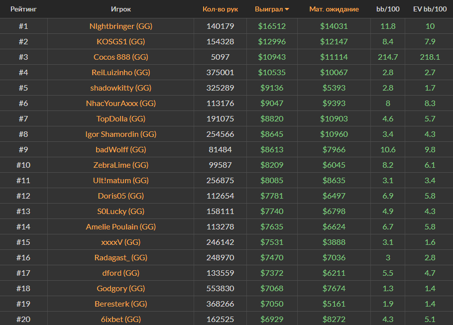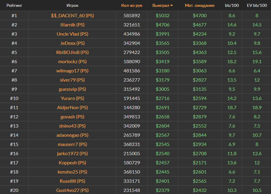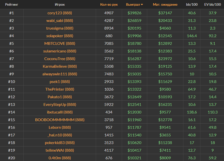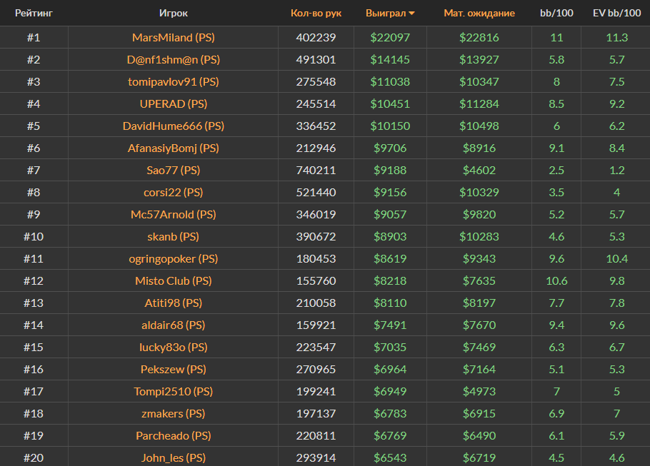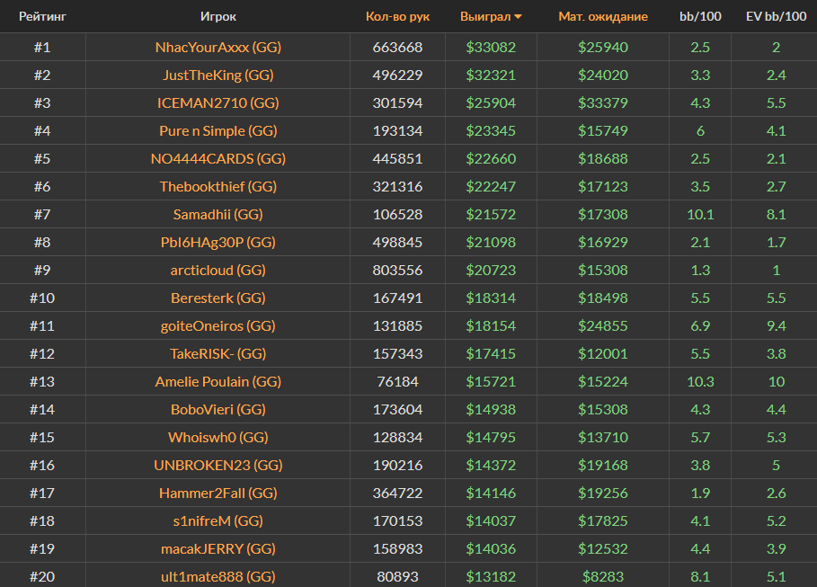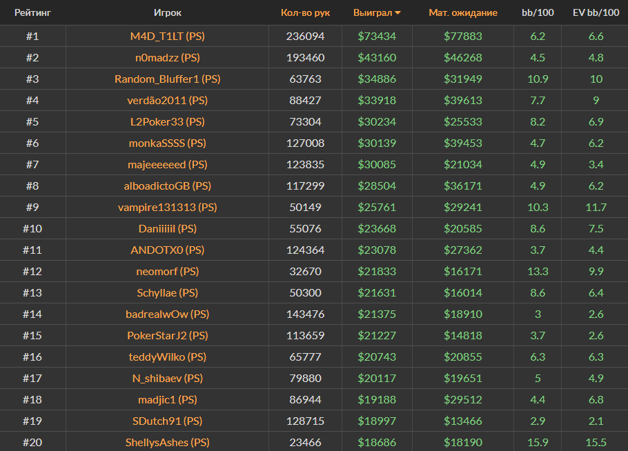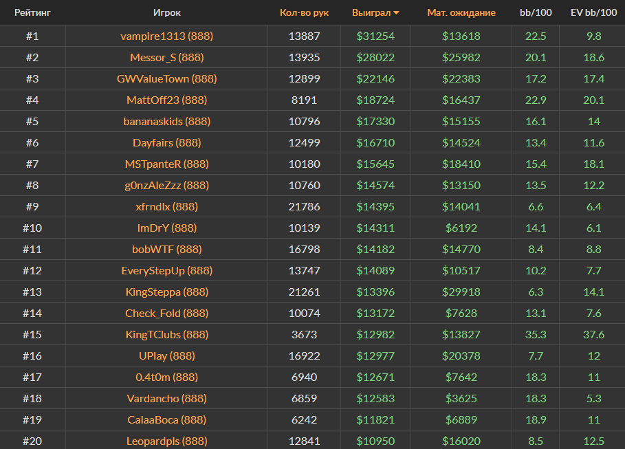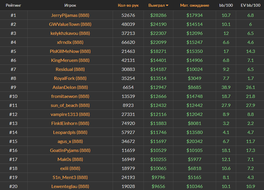 Самые успешные игроки за кэш-столами Холдема за весь предыдущий год на PokerStars, ПокерОК и 888poker.