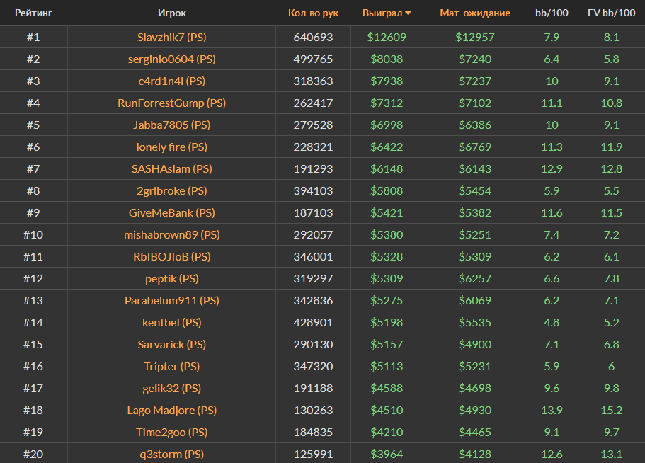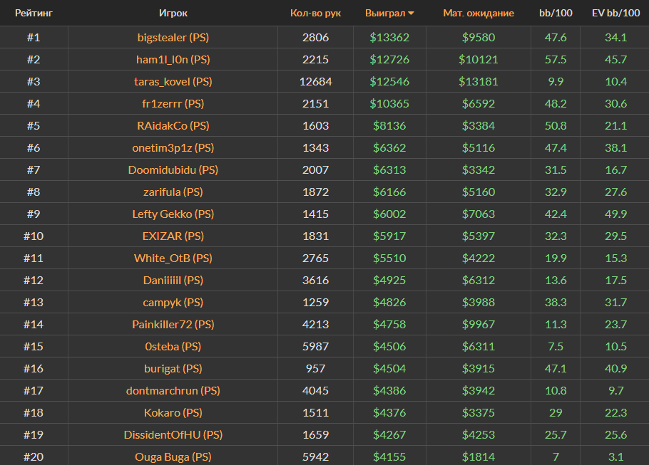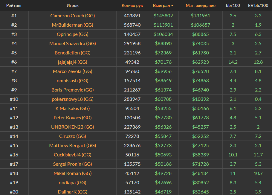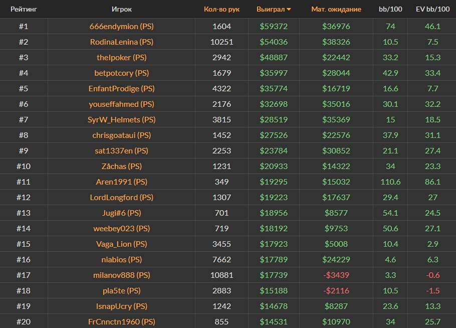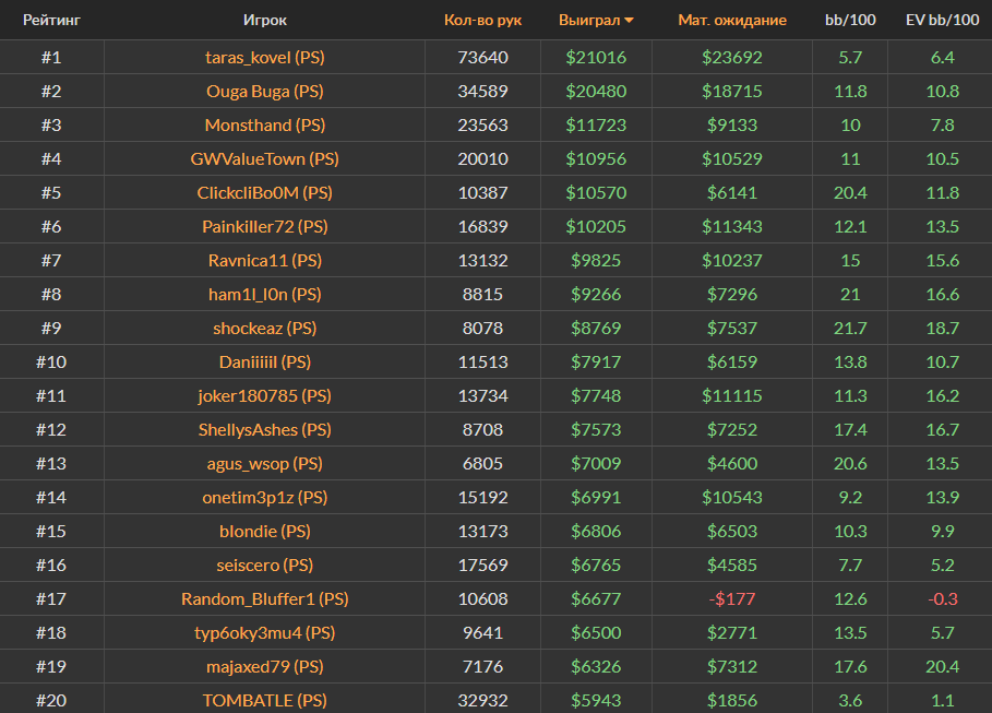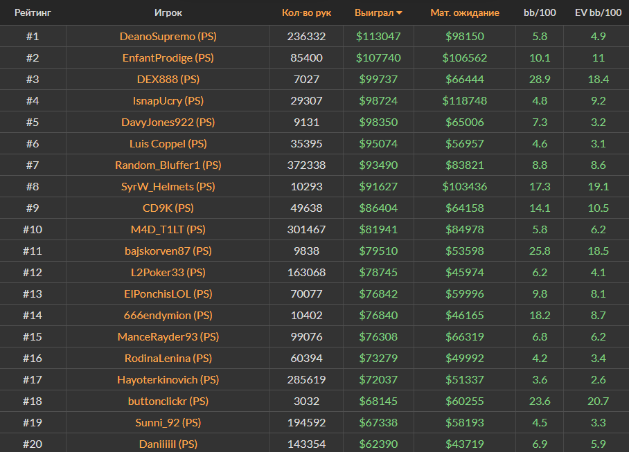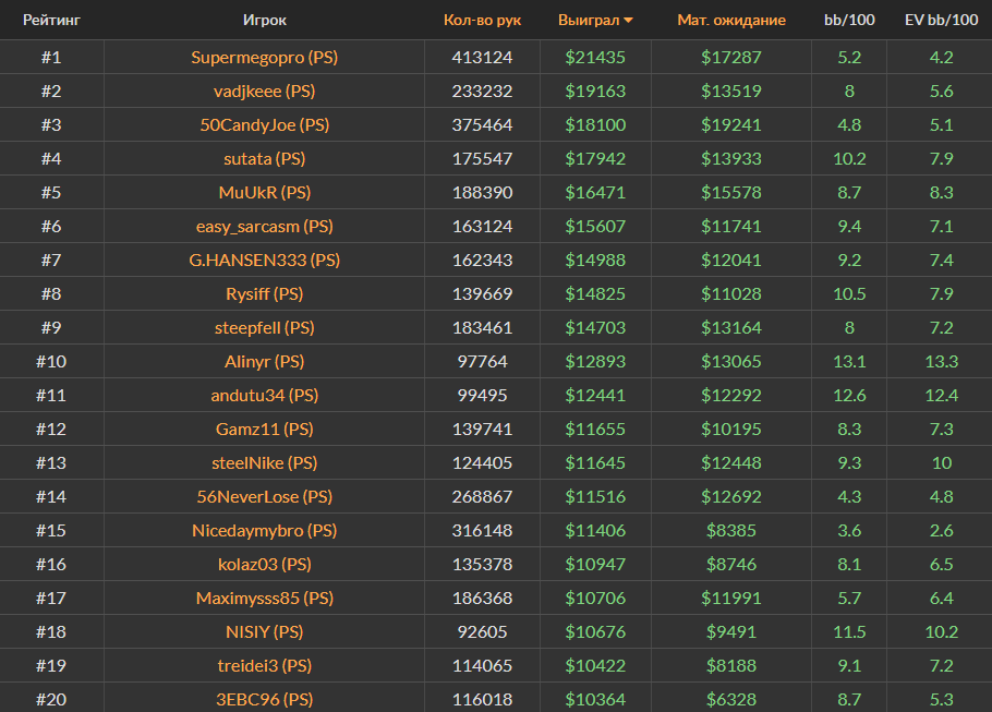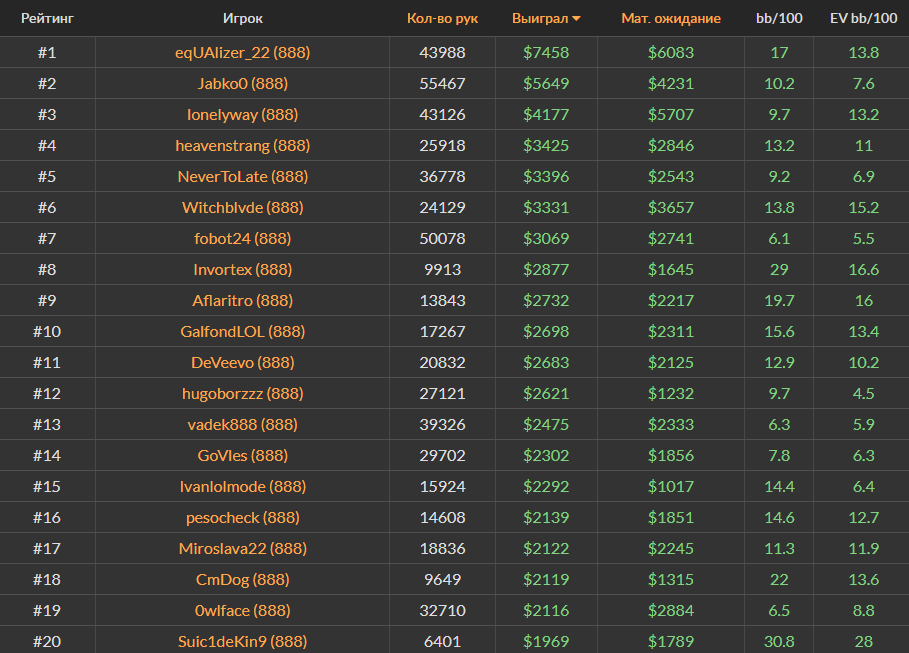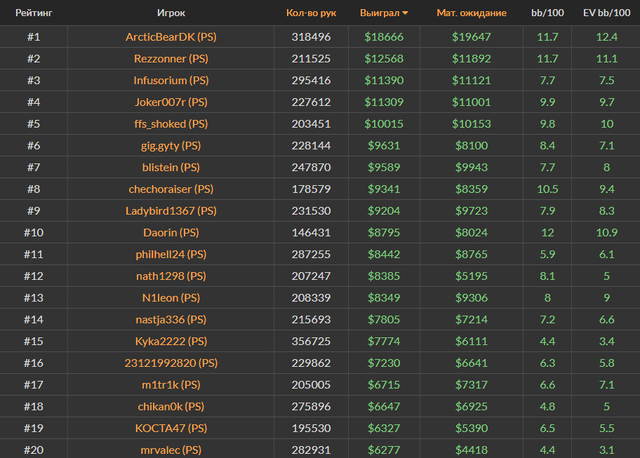 Самые успешные игроки за кэш-столами Холдема за весь предыдущий год на PokerStars, ПокерОК и 888poker.