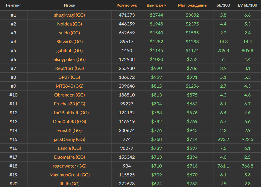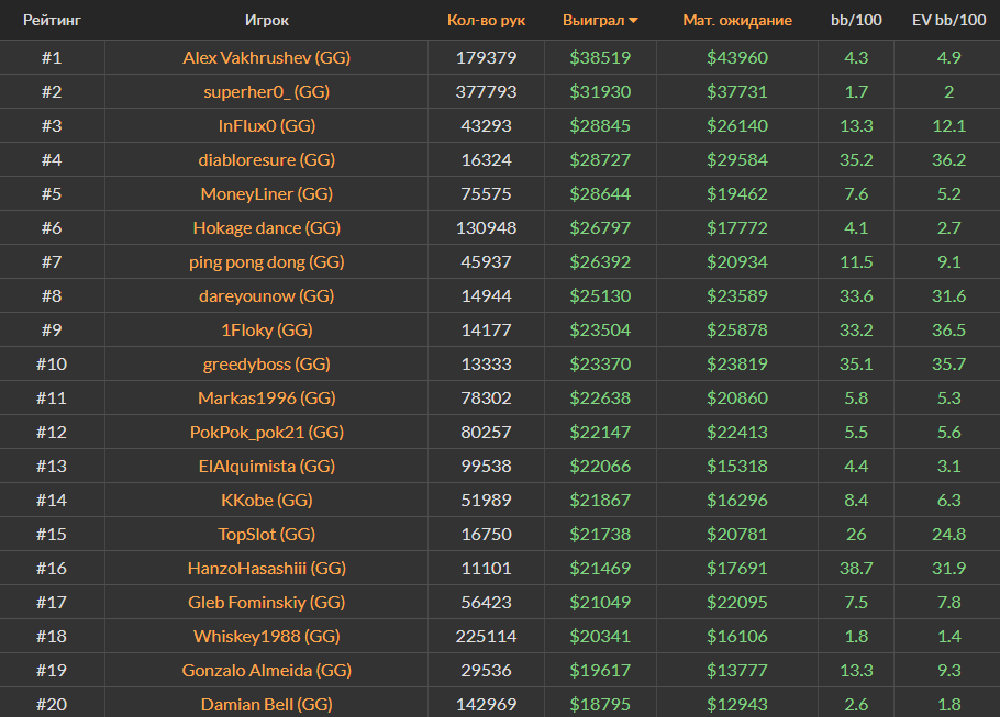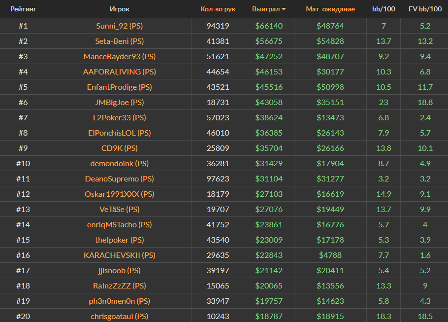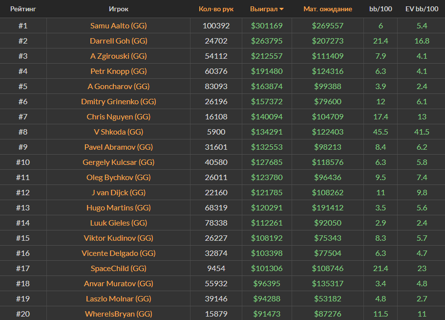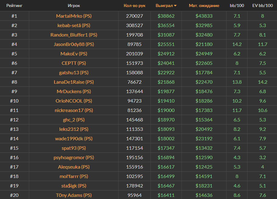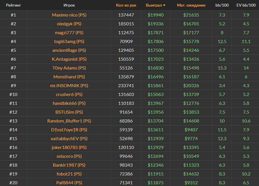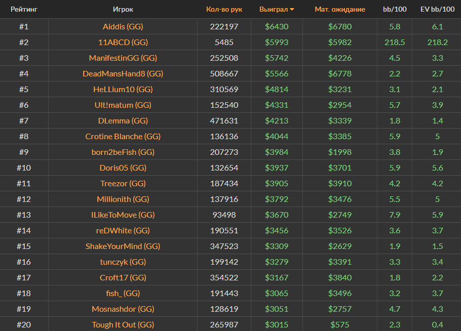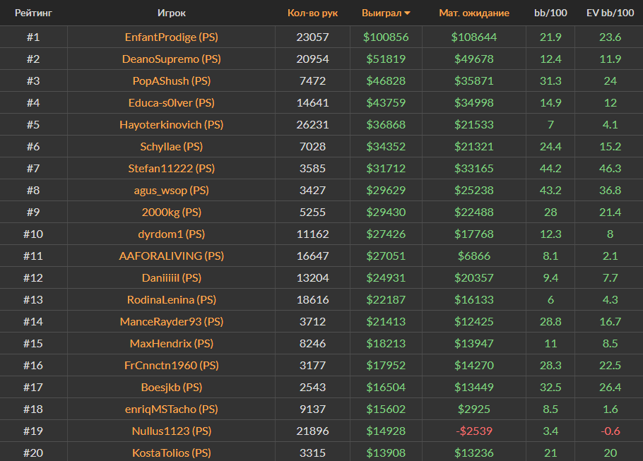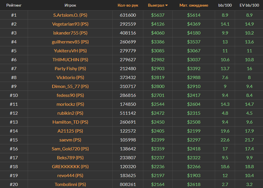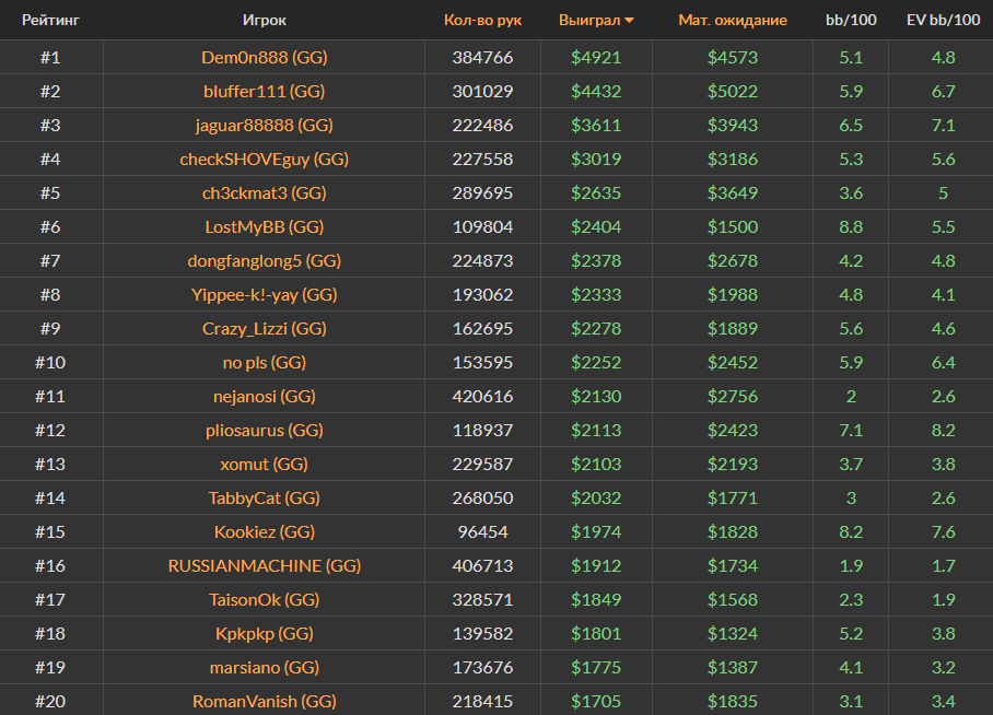 Самые успешные игроки за кэш-столами Холдема за весь предыдущий год на PokerStars, ПокерОК и 888poker.