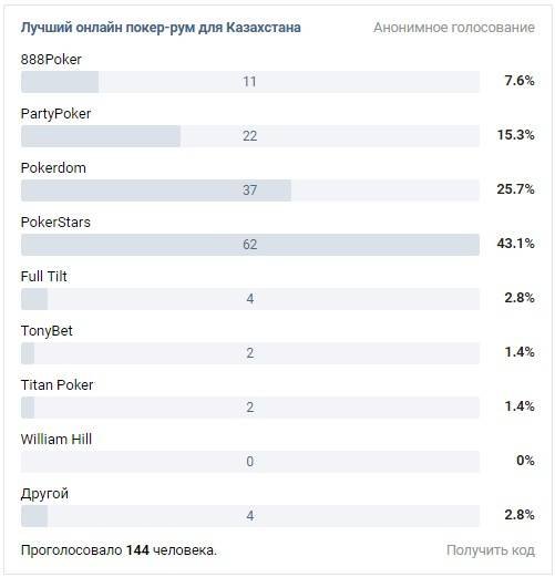 Лучшим онлайн покер-румом по мнению игроков из Казахстана стал PokerStars, набравший 43% голосов от всех участвовавших в опросе.