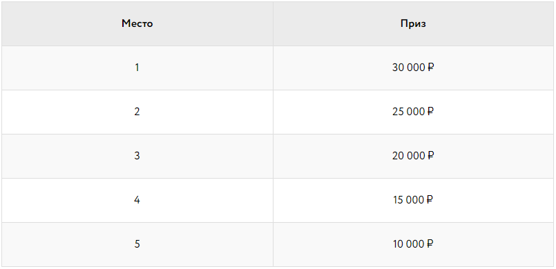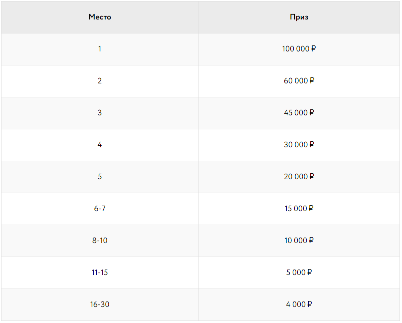 Призовой фонд 400 000 ₽ будет распределен среди ТОП-30 игроков таблицы лидеров: