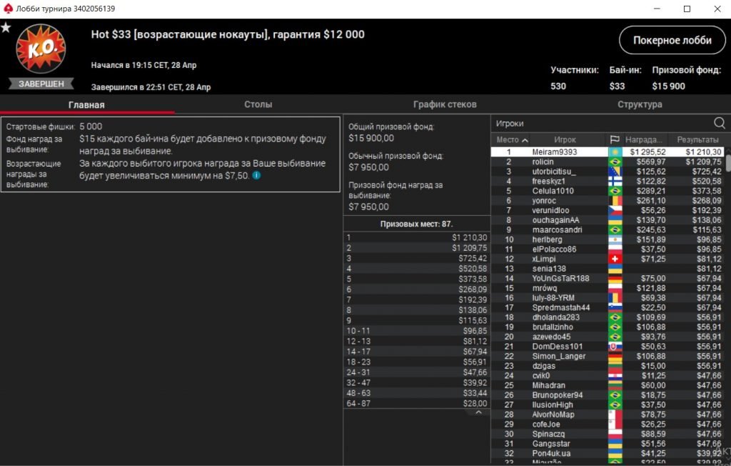 “Meiram9393” за 1-е место забрал $2,505 — $1,210 призовых и $1,295 нокаутов.