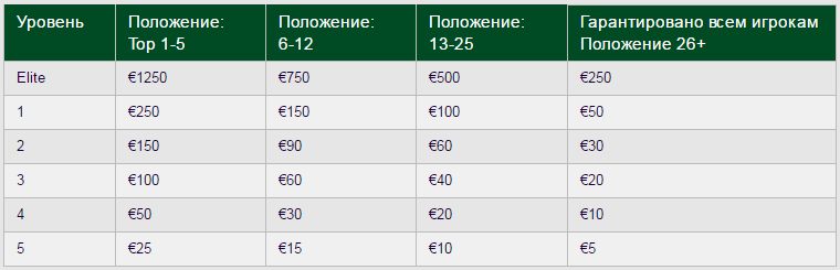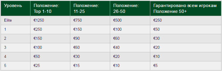 Призы определяются уровнем, который вы получаете по своим достижениям по очкам лояльности, и вашим положением в турнире.
