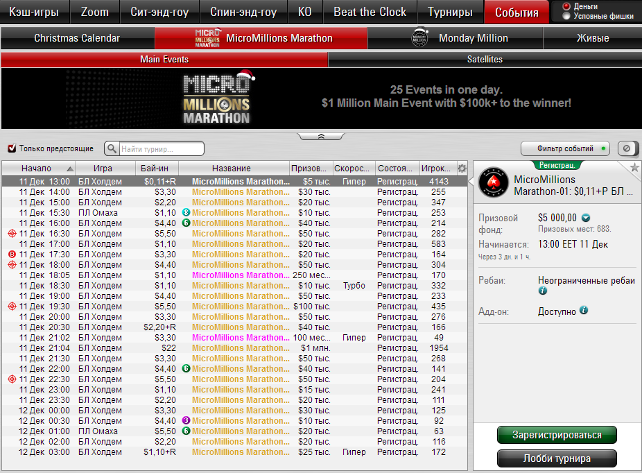 11 декабря покер-рум проведет скоротечную серию Micro Millions Marathon, и в течение суток пройдет 25 турниров с низкими бай-инами. Ключевым ивентом станет Главное событие с бай-ино $22 и гарантированным призовым фондом в $1,000,000. Победитель турнира получит $100,000!