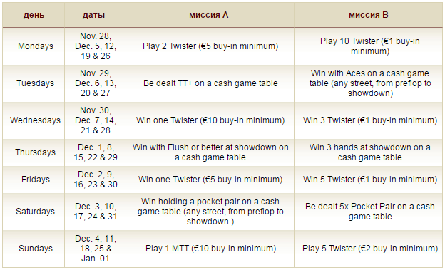 Выполняйте миссии, описанные ниже (Миссия A или B и получите билеты на фриролл “€1,000 Зимние Чудеса” / “€2,500 Зимние Чудеса” в формате олл-ин шутаут. Максимум 1 билет в день.