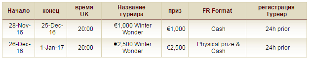 Участвуя в акции “€100K Зимние Чудеса” и выигрывайте часть денежных призов из большого фонда. Акция проходит по 1 января 2017 года, и включает в себя множество фрироллов, в числе которых “€20,000 Зимние Чудеса”.