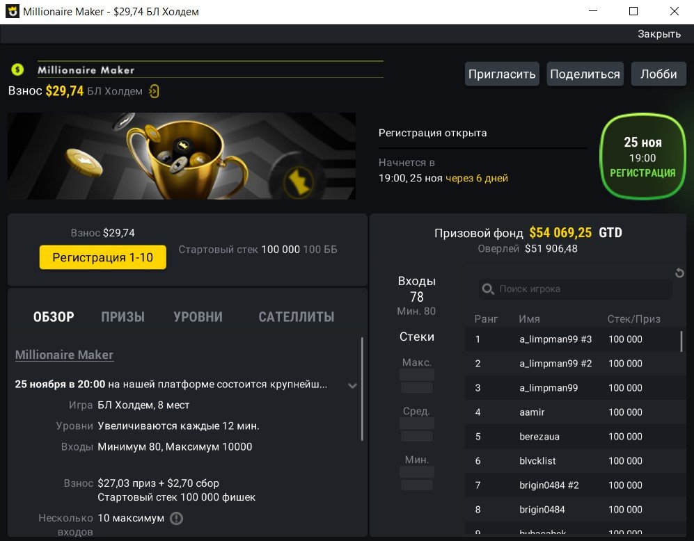 Отобраться на ивент можно через сателлиты — указаны в лобби турнира.