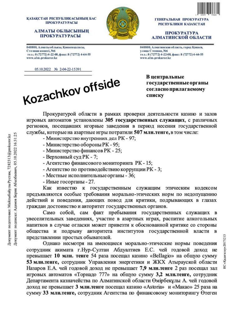 Напомним, что недавно Генпрокуратура задержала 305 госслужащих, которые проиграли 507 миллионов тенге в казино. Среди любителей азартных игр оказались сотрудники МВД, Минобороны, Минфина, Верховного суда, Агентства по финмониторингу, Антикора и чиновники из регионов.