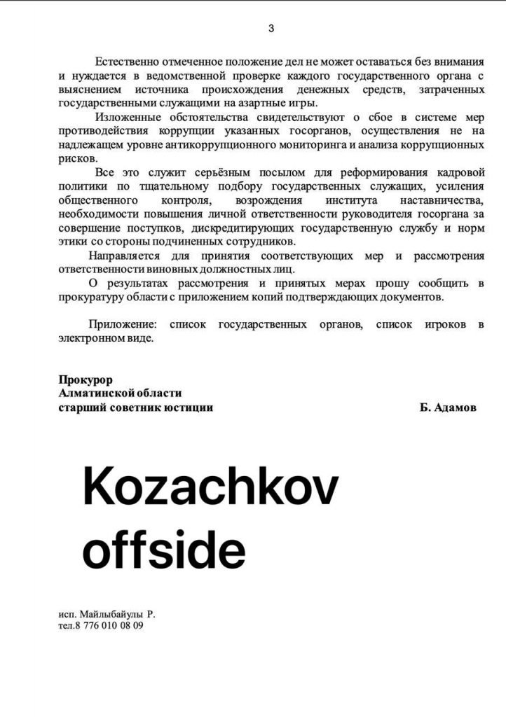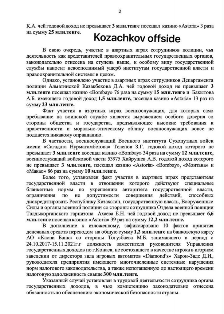 Министерство обороны ответило на запрос и сообщило, что в результате проверки было обнаружено 63 военнослужащих ВС РК, которые играли в азартные игры. Однако на канале журналиста Михаила Козачкова был опубликован список, в котором указано, что в Министерстве обороны игроков было 95, но это не было подтверждено.