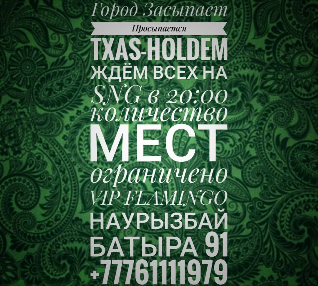 “ALLinBingo-Bastau” лучший клуб для игры Бинго-37 в Алматы! *Работает для вас 24/7⏱ *Лучшие столы Texas Holdem♥♠♦♣ *Каждую пятницу рейтинговый турнир начало, которого в 19:00 Очки в рейтинг начисляются каждому участнику турнира, в зависимости от бай-ин и занятого места в турнире по накоплению за весь период! *Розыгрыш 50.000тенге (В пятницу начало — 23:00) * Бесплатный Фуршет и напитки???? *Лучший кальян по лучшей цене? * Большой ассортимент по бару?? *Каждое утро бесплатные завтраки☕ *Качественное обслуживание✔ Всё для Вас, отдыхайте элитно, играйте и конечно же выигрывайте! |