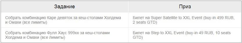Каждый день к турниру проходят сателлиты от 49 рублей, а также ежедневные задания, с помощью которых вы можете бесплатно отобраться на XXL Event 200 000 RUB GTD.