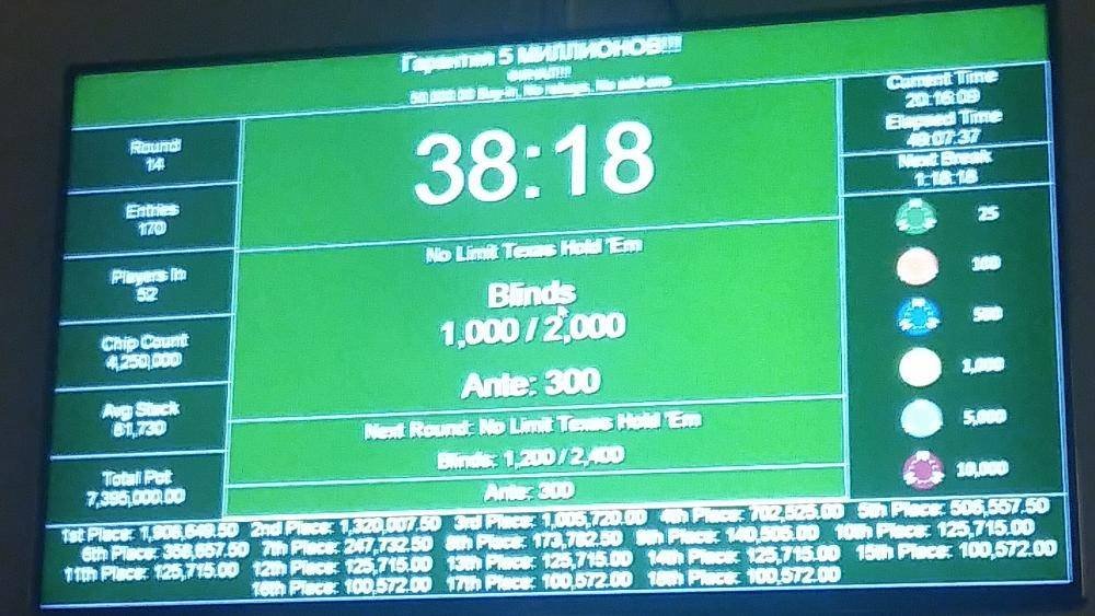 В турнире было сделано 170 входов, а призовой фонд увеличился до 7,395,000 тенге. Выплаты начинались с 18 места – 100К тг., а победителю причиталось почти 2 миллиона.