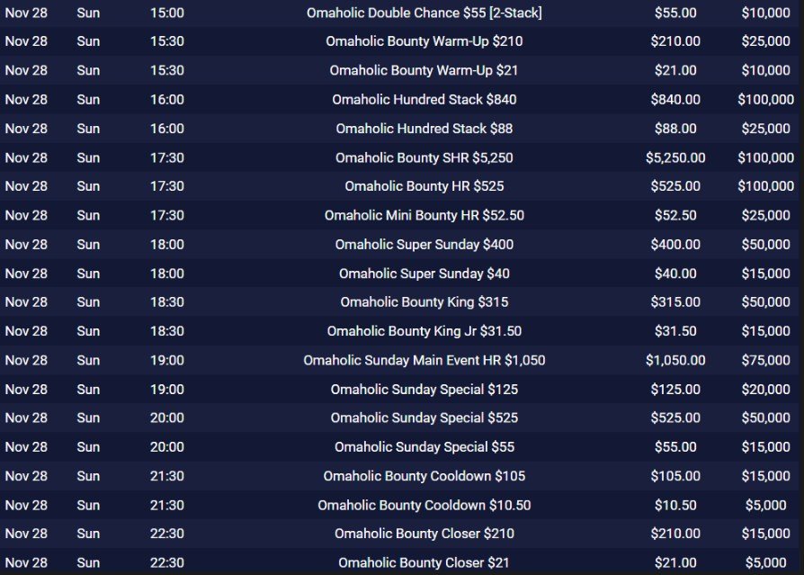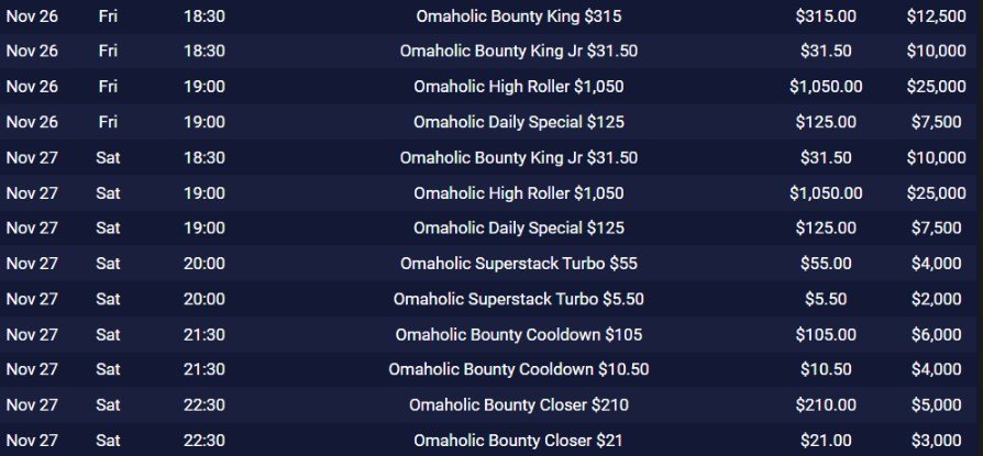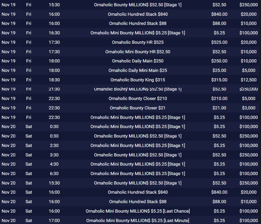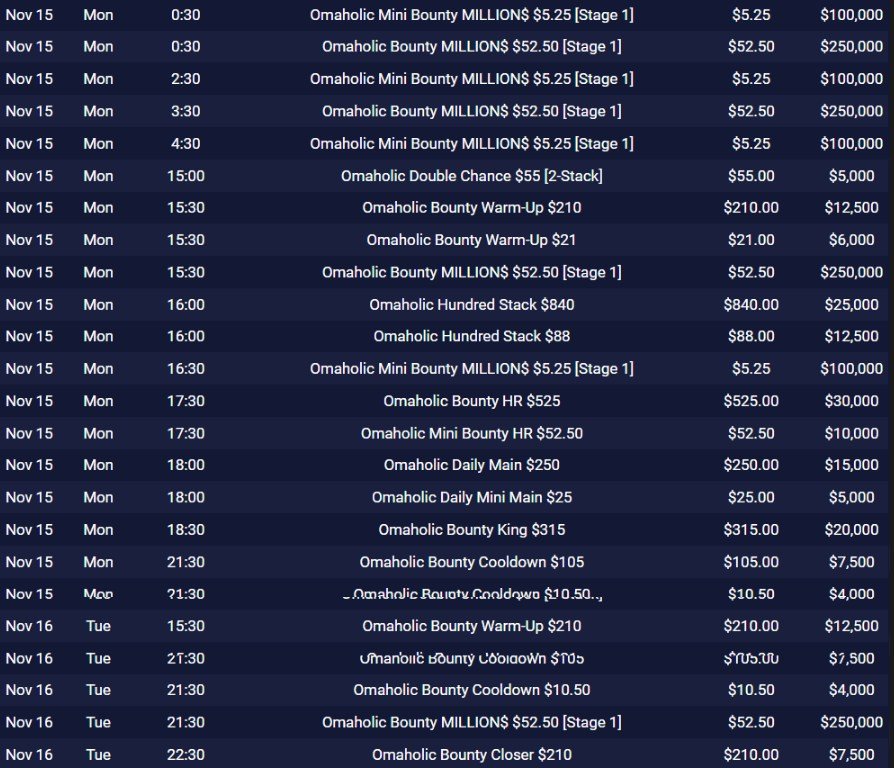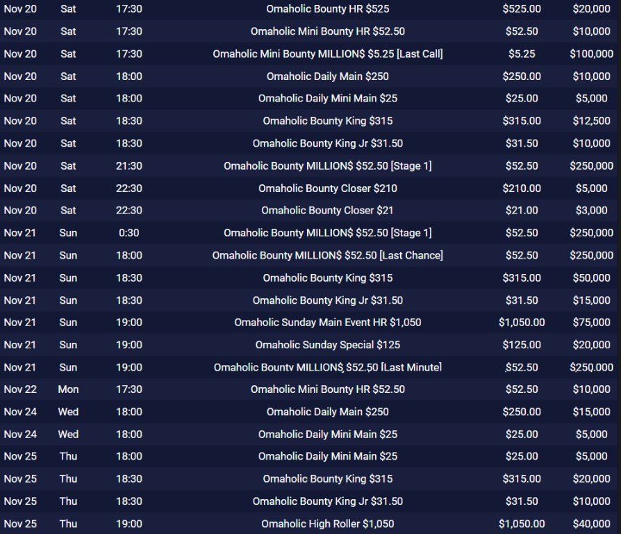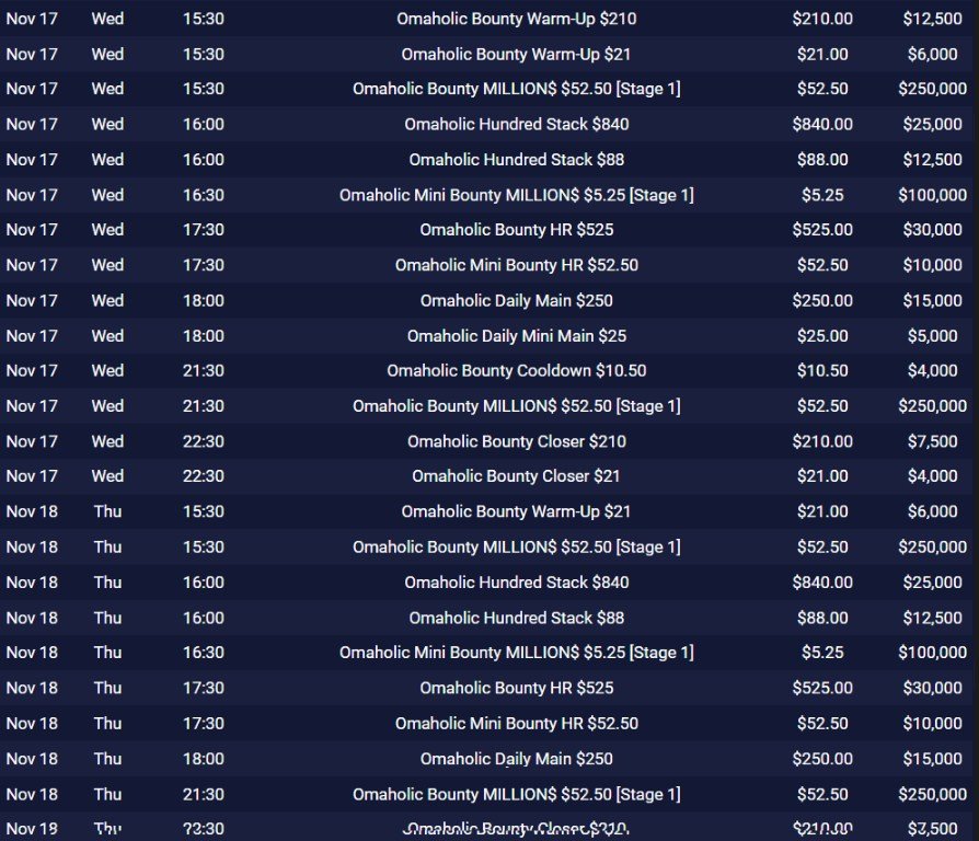 В расписании представлено 90 турниров с бай-инами от $5,25 до $5,250. Среди них два ивента пройдут в формате многодневных — Omaholic Bounty MILLION$ и Omaholic Mini Bounty MILLION$.