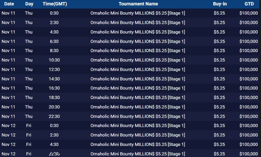 - Суббота, 21:30 МСК: Omaholic Mini Bounty MILLION$, бай-ин $5,25, гарантия $100,000