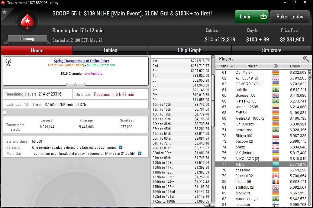 Наш игрок по ником “Artyto” перешел во второй день SCOOP-55-L со стеком 5,771 млн. Он занимает 77 место из 214 оставшихся участников. Минимальный приз составляет $1,049.
