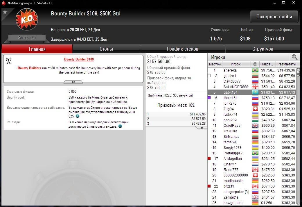 Лучший результат показал “gabit134”, который в турнире Bounty Builder занял 5 место, заработав более $5К с учетом наград за выбивание. Бай-ин ивента составил $109, в нем приняло участие более 1,5К игроков, а призовой фонд вырос до $157К.