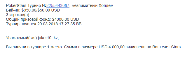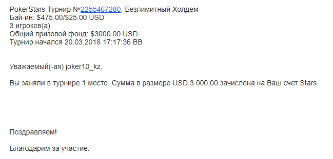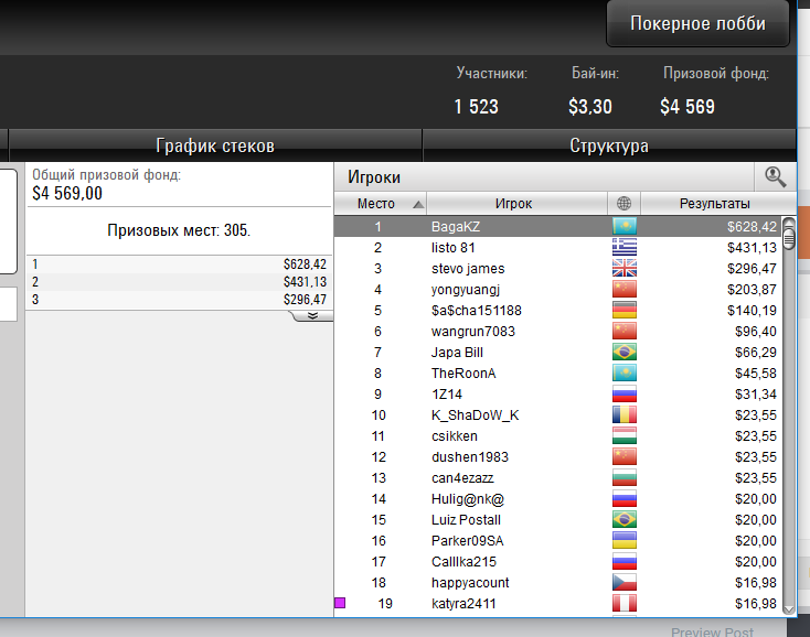 В ивенте за $3,30, в котором было сделано 1,523 входа, игрок вышел за финальный стол и стал победителем, заработав $628.